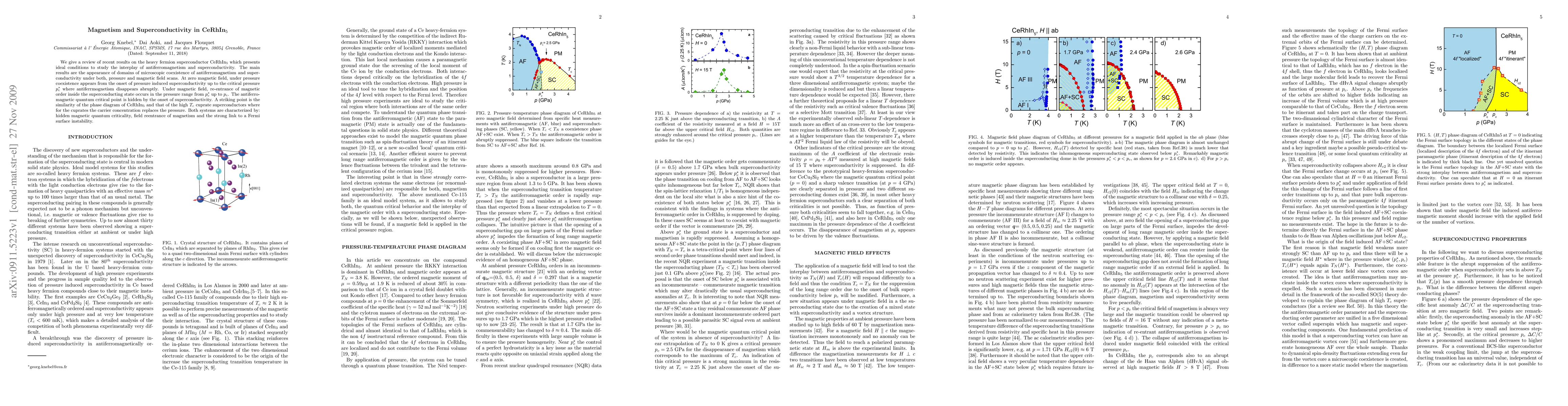We give a review of recent results on the heavy fermion superconductor CeRhIn$_5$ which presents ideal conditions to study the interplay of antiferromagnetism and superconductivity. The main results are the appearance of domains of microscopic coexistence of antiferromagnetism and superconductivity under both, pressure and magnetic field scans. At zero magnetic field, under pressure coexistence appears from the onset of pressure induced superconductivity up to the critical pressure $p_c^\star$ where antiferrmognetism disappears abruptly. Under magnetic field, re-entrance of magnetic order inside the superconducting state occurs in the pressure range from $p_c^\star$ up to $p_c$. The antiferromagnetic quantum critical point is hidden by the onset of superconductivity. A striking point is the similarity of the phase diagram of CeRhIn$_5$ and that of the high $T_c$ cuprate superconductors where for the cuprates the carrier concentration replaces the pressure. Both systems are characterized by: hidden magnetic quantum criticality, field reentrance of magnetism and the strong link to a Fermi surface instability.