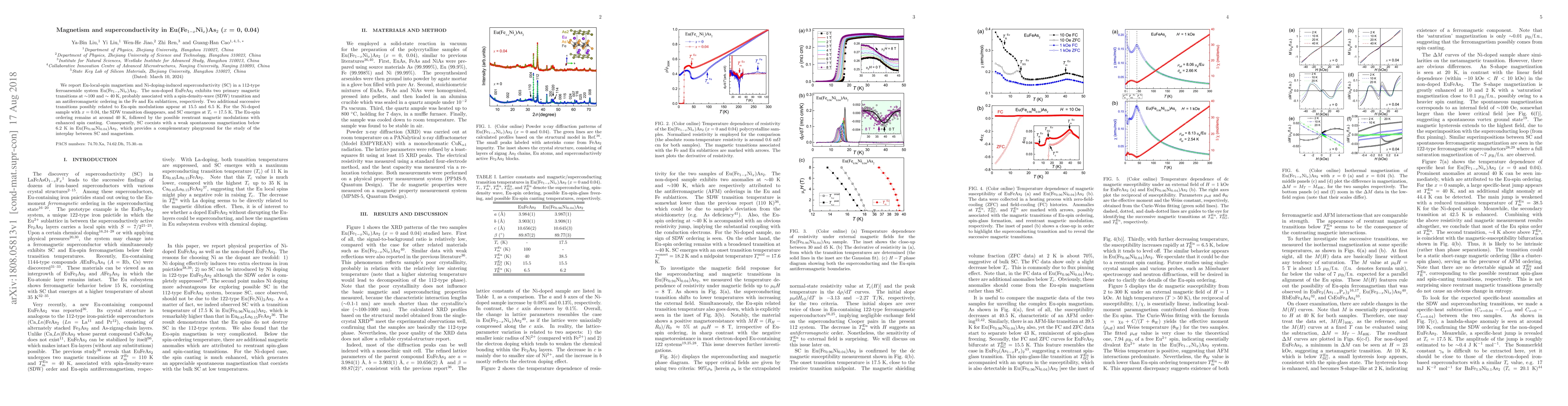 Researchers discovered magnetism in Eu(Fe$_{1-x}$Ni$_{x}$)As$_2$ and superconductivity at 17.5 K after Ni doping, with SC coexisting with weak spontaneous magnetization below 6.2 K.