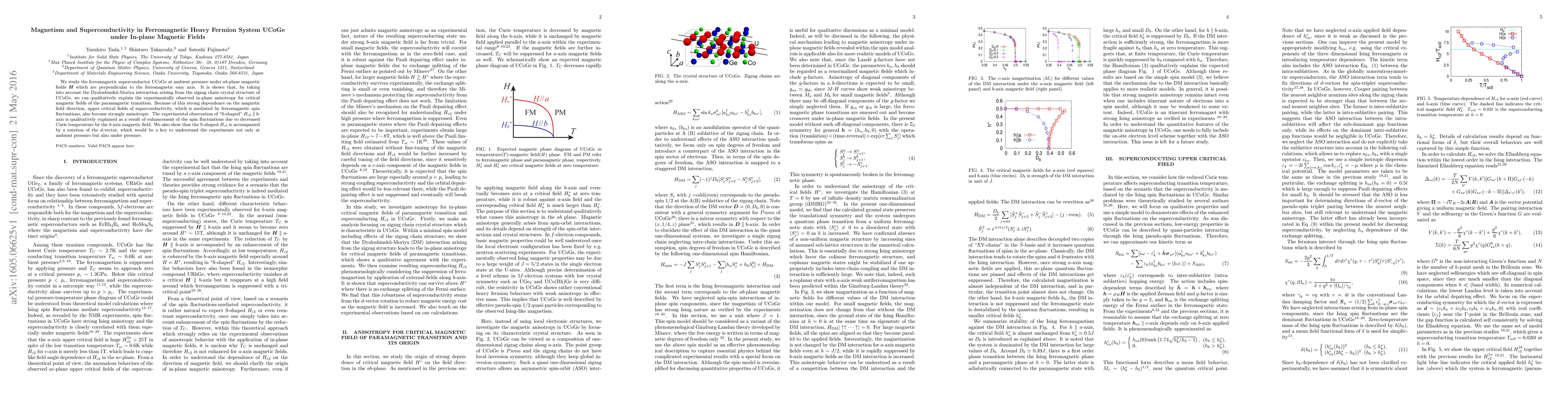 This study investigates the interplay between magnetism and superconductivity in the ferromagnetic heavy fermion system UCoGe under in-plane magnetic fields. The observed anisotropy in critical magnetic fields and the "S-shaped" upper critical field are explained by the Dyaloshinskii-Moriya interaction and the resulting spin fluctuation enhancement.