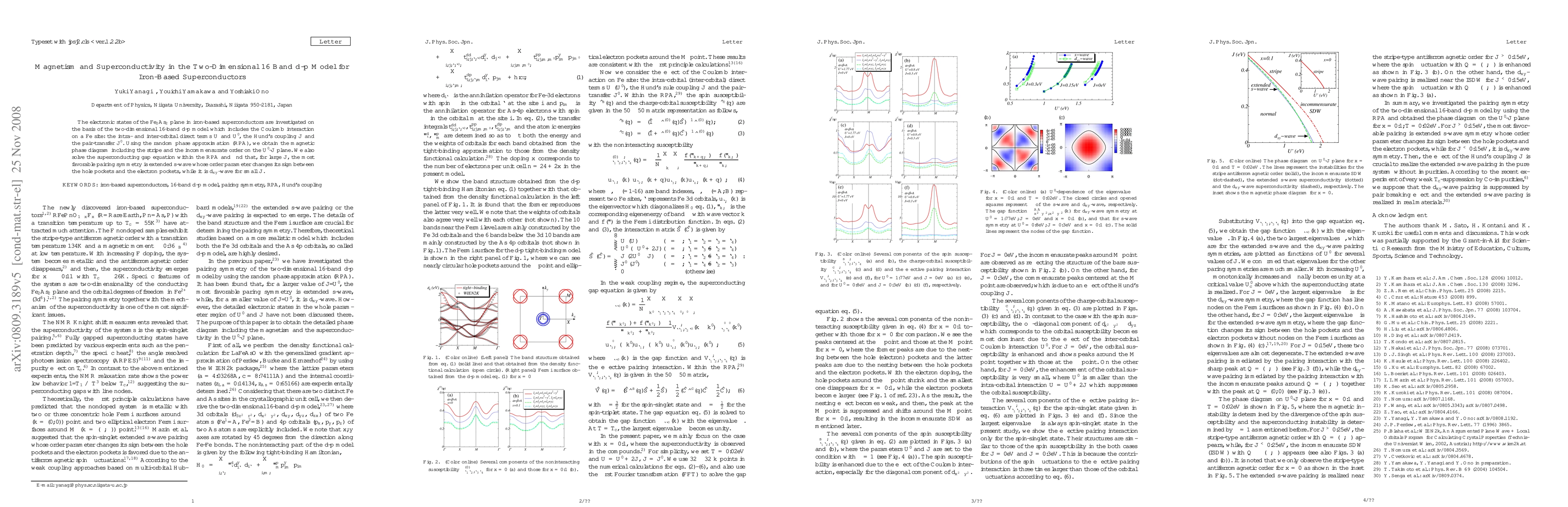 This paper investigates the electronic states in iron-based superconductors using a two-dimensional 16-band d-p model, revealing magnetic phase diagrams and superconductivity pairing symmetries via the random phase approximation. It finds extended s-wave pairing for large Hund's coupling and dxy-wave for small coupling.