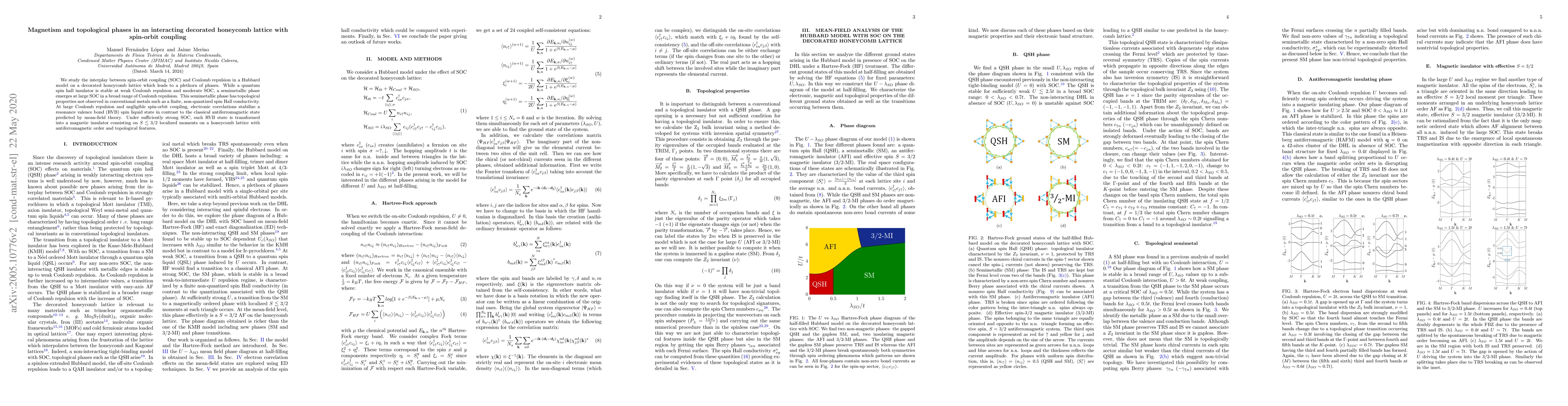 We study the interplay between spin-orbit coupling (SOC) and Coulomb repulsion in a Hubbard model on a decorated honeycomb lattice which leads to a plethora of phases. While a quantum spin hall insulator is stable at weak Coulomb repulsion and moderate SOC, a semimetallic phase emerges at large SOC in a broad range of Coulomb repulsion. This semimetallic phase has topological properties not observed in conventional metals such as a finite, non-quantized spin Hall conductivity. At large Coulomb repulsion and negligible spin-orbit coupling, electronic correlations stabilize a resonance valence bond (RVB) spin liquid state in contrast to the classical antiferromagnetic state predicted by mean-field theory. Under sufficiently strong SOC, such RVB state is transformed into a magnetic insulator consisting on S~3/2 localized moments on a honeycomb lattice with antiferromagnetic order and topological features.