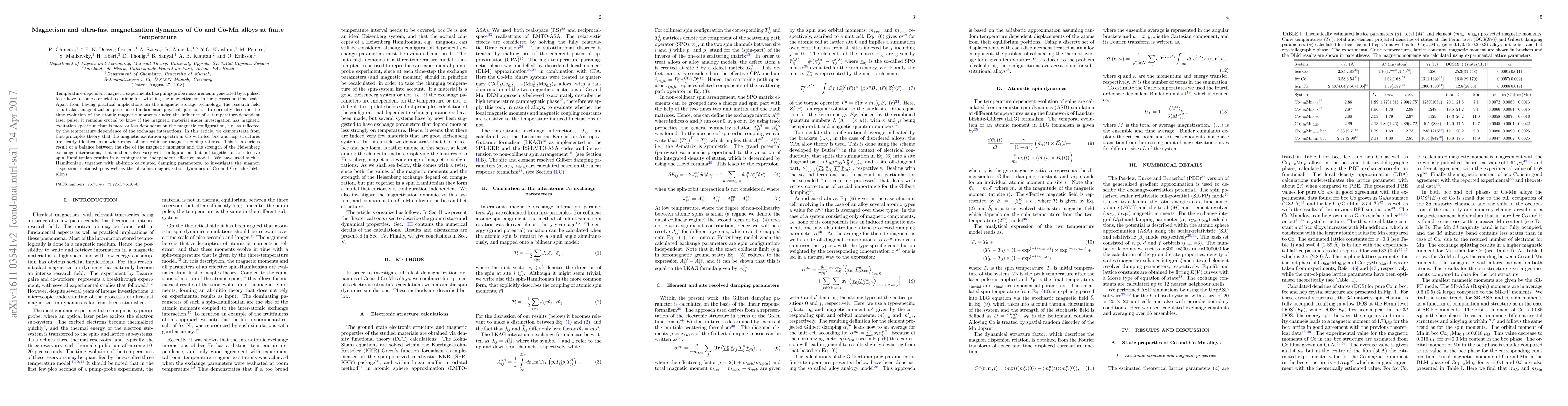 Temperature-dependent magnetic experiments like pump-probe measurements generated by a pulsed laser have become a crucial technique for switching the magnetization in the picosecond time scale. Apart from having practical implications on the magnetic storage technology, the research field of ultrafast magnetization poses also fundamental physical questions. To correctly describe the time evolution of the atomic magnetic moments under the influence of a temperature-dependent laser pulse, it remains crucial to know if the magnetic material under investigation has magnetic excitation spectrum that is more or less dependent on the magnetic configuration, e.g. as reflected by the temperature dependence of the exchange interactions. In this article, we demonstrate from first-principles theory that the magnetic excitation spectra in Co with fcc, bcc and hcp structures are nearly identical in a wide range of non-collinear magnetic configurations. This is a curious result of a balance between the size of the magnetic moments and the strength of the Heisenberg exchange interactions, that in themselves vary with configuration, but put together in an effective spin Hamiltonian results in a configuration independent effective model. We have used such a Hamiltonian, together with ab-initio calculated damping parameters, to investigate the magnon dispersion relationship as well as the ultrafast magnetisation dynamics of Co and Co-rich CoMn alloys.