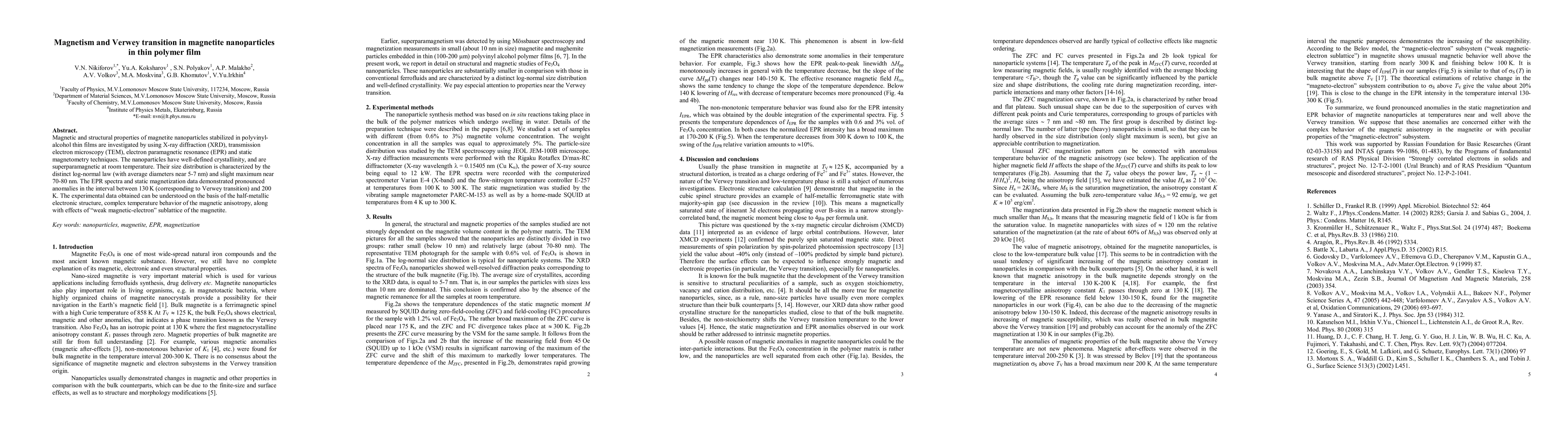 This study investigates magnetite nanoparticles embedded in polyvinyl-alcohol thin films, revealing their superparamagnetic behavior at room temperature and a distinct log-normal size distribution. The Verwey transition is observed between 130 K and 200 K, linked to anomalies in electron paramagnetic resonance and magnetization data, attributed to the half-metallic structure and magnetic anisotropy.