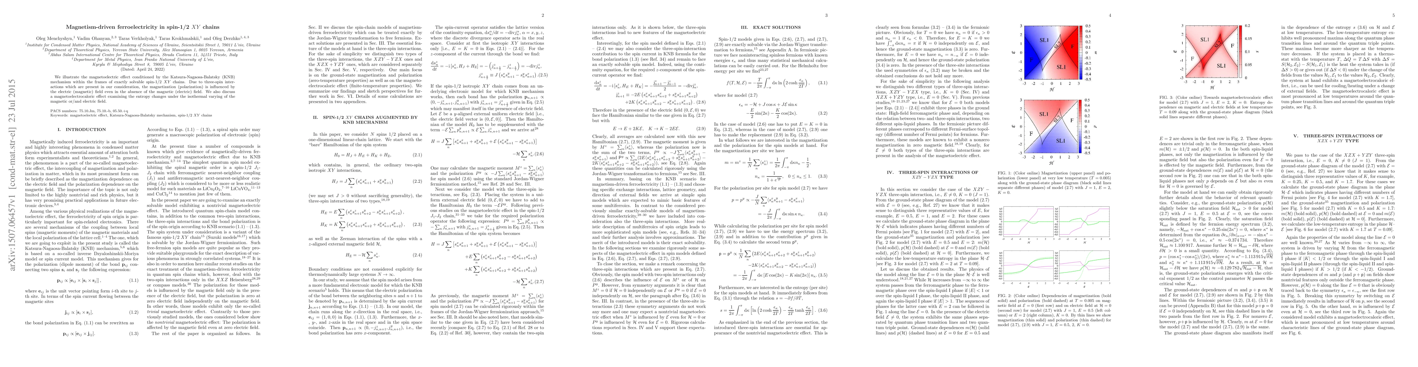 We illustrate the magnetoelectric effect conditioned by the Katsura-Nagaosa-Balatsky (KNB) mechanism within the frames of exactly solvable spin-1/2 $XY$ chains. Due to three-spin interactions which are present in our consideration, the magnetization (polarization) is influenced by the electric (magnetic) field even in the absence of the magnetic (electric) field. We also discuss a magnetoelectrocaloric effect examining the entropy changes under the isothermal varying of the magnetic or/and electric field.