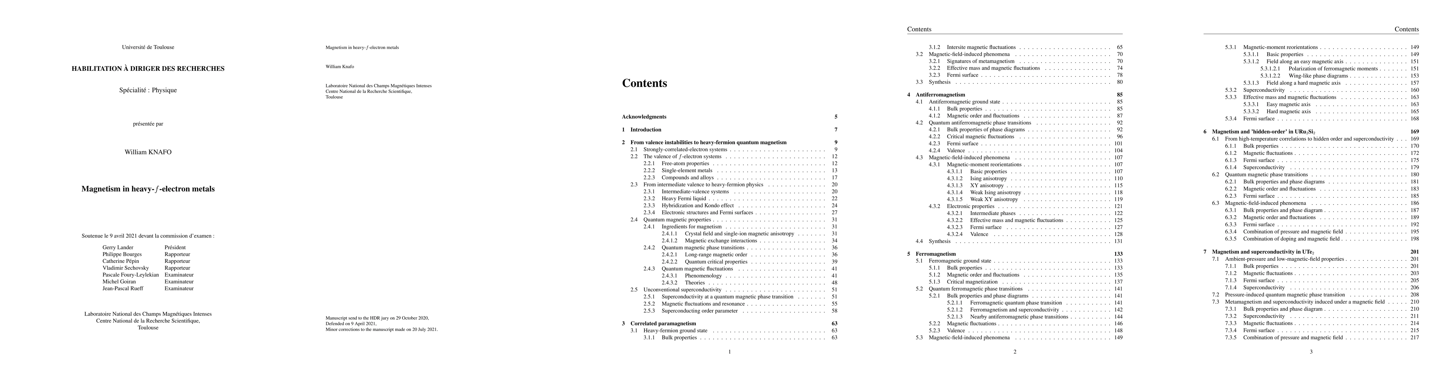 In this document, I present a personal view on the heavy-fermion problem, within a phenomenological approach guided by experiments. This review presents a set of 'historical' works which established the ground bases of the thematic during the last decades. An exhaustive and systematic approach is privileged. After a general presentation in Chapter 2, the properties of heavy-fermion paramagnets, antiferromagnets, and ferromagnets are considered in Chapters 3, 4, and 5, respectively. Chapters 6 and 7 are dedicated to two specific compounds, URu$_2$Si$_2$ for which a 'hidden-order' phase constitutes a more-than-thirty-years-old unsolved mystery, and UTe$_2$, where multiple superconducting phases have been discovered in the last two years. Experiments performed using a panel of techniques ranging from microscopic (neutron scattering, NMR, etc.) to thermodynamic (specific heat, magnetization, etc.) and transport (electrical resistivity, etc.) probes, under extreme conditions of low temperatures, intense magnetic fields and high pressures, are reviewed. They show that magnetism plays a central role in the quantum critical properties of heavy-fermion systems. An emphasis is given to the intersite magnetic fluctuations, presented as the driving force for a heavy Fermi liquid, precursor of quantum magnetic criticality ending in magnetically-ordered phases. They are also suspected to drive an unconventional mechanism for superconductivity, which develops in the vicinity of quantum magnetic phase transitions induced under pressure or magnetic field. The appearance of magnetic fluctuations and ultimately magnetic order in heavy-fermion compounds occurs in a nearly-integer-valence regime, in which $f$ electrons have a dual itinerant-localized character. Fermi-surface and valence studies, which give complementary information about this duality, are also considered.