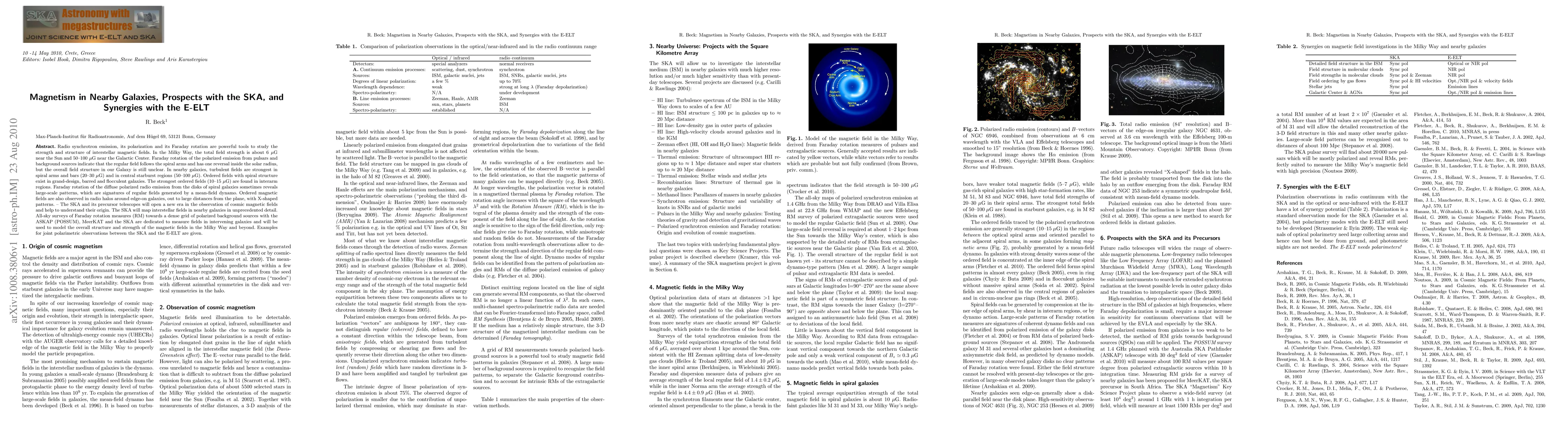 This paper explores the use of radio synchrotron emission and its polarization to study interstellar magnetic fields in nearby galaxies, highlighting the potential of the SKA and its precursor telescopes to advance our understanding of these fields. It also discusses synergies between the SKA and the E-ELT for joint polarimetric observations.