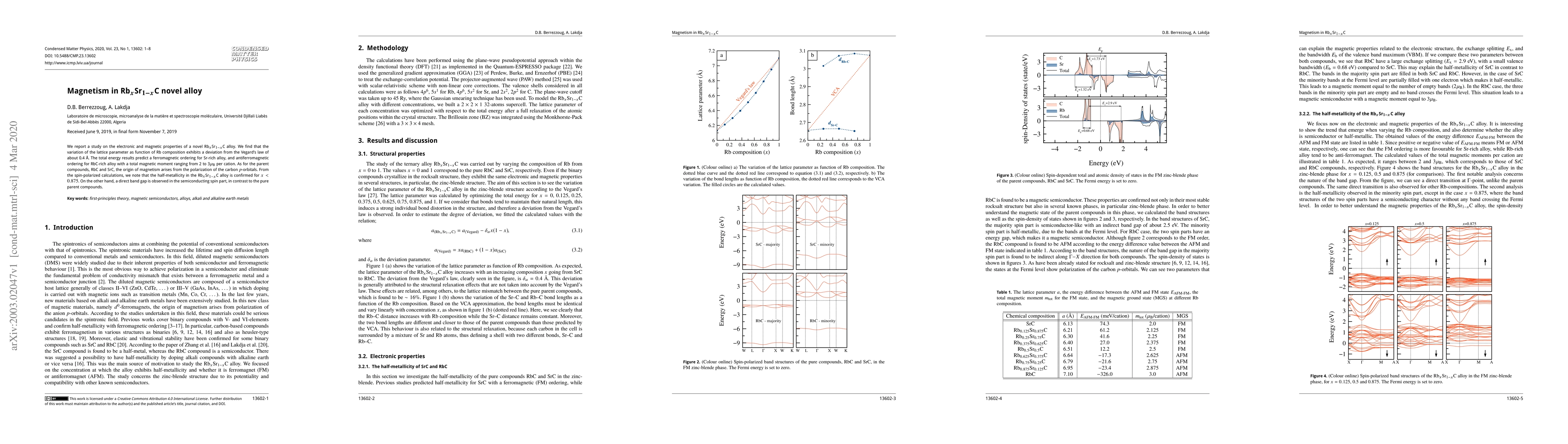 We report a study on the electronic and magnetic properties of a novel Rb$_{x}$Sr$_{1-x}$C alloy. We find that the variation of the lattice parameter as function of Rb composition exhibits a deviation from the Vegard's law of about 0.4 {\AA}. The total energy results predict a ferromagnetic ordering for Sr-rich alloy, and antiferromagnetic ordering for RbC-rich alloy with a total magnetic moment ranging from 2 to 3$\mu_\text{B}$ per cation. As for the parent compounds, RbC and SrC, the origin of magnetism arises from the polarization of the carbon $p$-orbitals. From the spin-polarized calculations, we note that the half-metallicity in the Rb$_{x}$Sr$_{1-x}$C alloy is confirmed for $x<0.875$. On the other hand, a direct band gap is observed in the semiconducting spin part, in contrast to the pure parent compounds.
