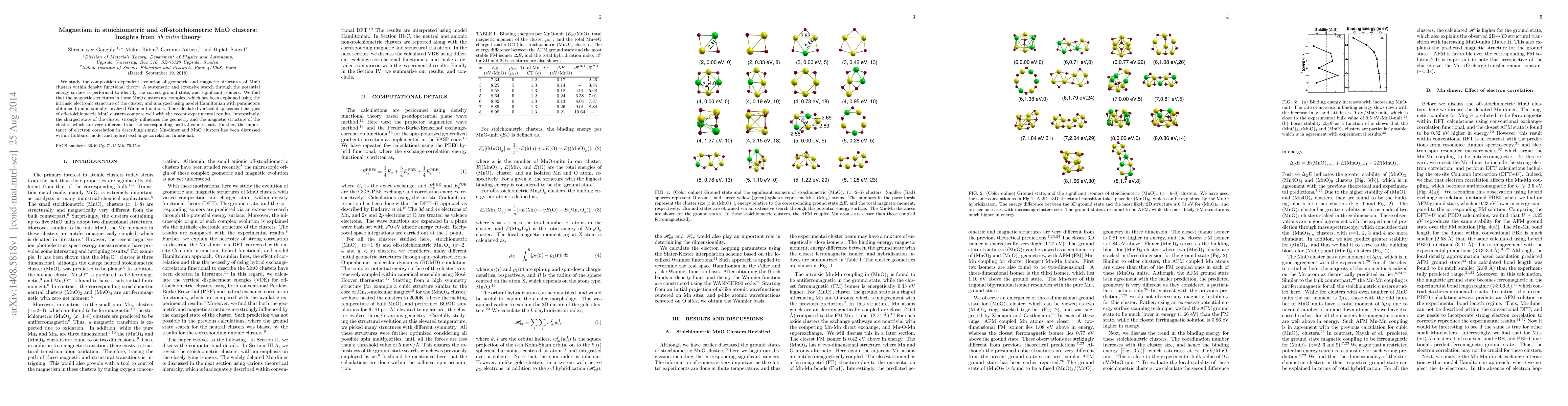 We study the composition dependent evolution of geometric and magnetic structures of MnO clusters within density functional theory. A systematic and extensive search through the potential energy surface is performed to identify the correct ground state, and significant isomers. We find that the magnetic structures in these MnO clusters are complex, which has been explained using the intrinsic electronic structure of the cluster, and analyzed using model Hamiltonian with parameters obtained from maximally localized Wannier functions. The calculated vertical displacement energies of off-stoichiometric MnO clusters compare well with the recent experimental results. Interestingly, the charged state of the cluster strongly influences the geometry and the magnetic structure of the cluster, which are very different from the corresponding neutral counterpart. Further, the importance of electron correlation in describing simple Mn-dimer and MnO clusters has been discussed within Hubbard model and hybrid exchange-correlation functional.