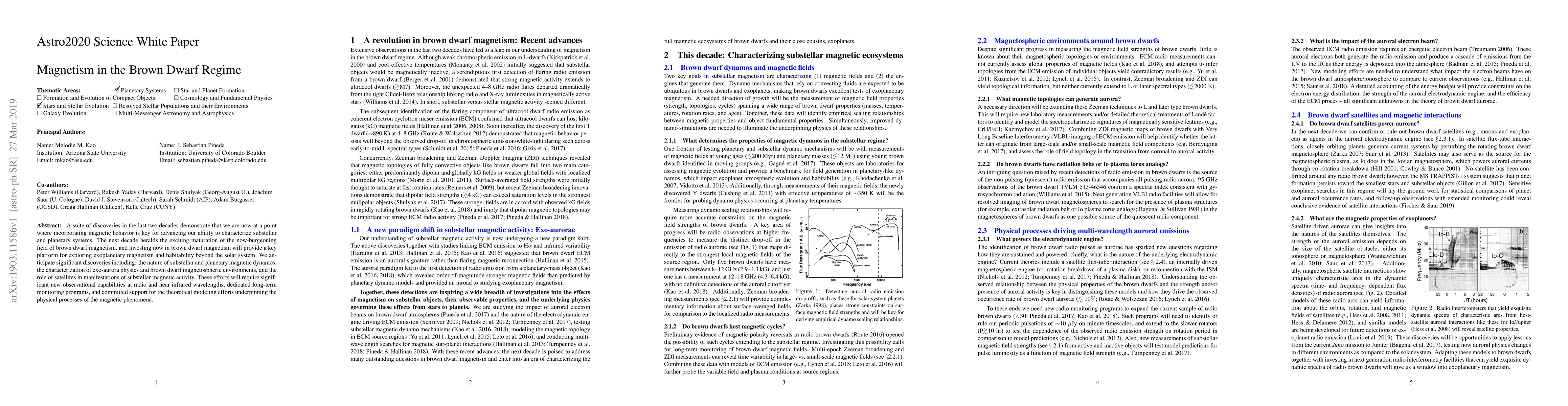 This paper explores the growing field of brown dwarf magnetism, which could lead to discoveries about exoplanetary magnetism and habitability. Researchers anticipate significant breakthroughs in understanding substellar magnetic dynamos and exo-aurora physics.