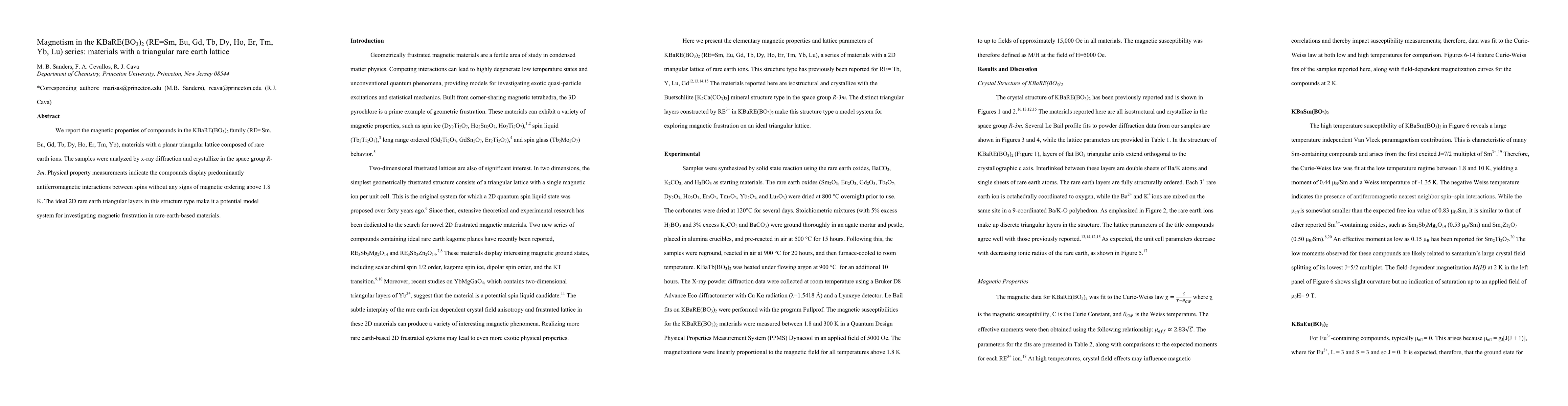 We report the magnetic properties of compounds in the KBaRE(BO3)2 family (RE= Sm, Eu, Gd, Tb, Dy, Ho, Er, Tm, Yb), materials with a planar triangular lattice composed of rare earth ions. The samples were analyzed by x-ray diffraction and crystallize in the space group R-3m. Physical property measurements indicate the compounds display predominantly antiferromagnetic interactions between spins without any signs of magnetic ordering above 1.8 K. The ideal 2D rare earth triangular layers in this structure type make it a potential model system for investigating magnetic frustration in rare-earth-based materials.