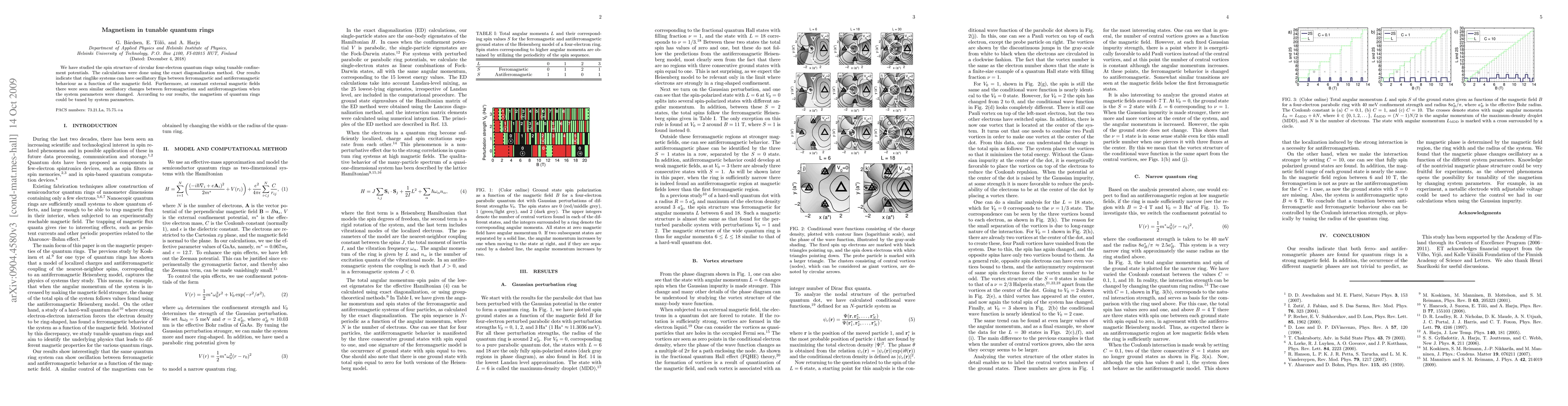 We have studied the spin structure of circular four-electron quantum rings using tunable confinement potentials. The calculations were done using the exact diagonalization method. Our results indicate that ringlike systems can have oscillatory flips between ferromagnetic and antiferromagnetic behaviour as a function of the magnetic field. Furthermore, at constant external magnetic fields there were seen similar oscillatory changes between ferromagnetism and antiferromagnetism when the system parameters were changed. Ackording to our results, the magnetism of quantum rings could be tuned by system parameters.We have studied the spin structure of circular four-electron quantum rings using tunable confinement potentials. The calculations were done using the exact diagonalization method. Our results indicate that ringlike systems can have oscillatory flips between ferromagnetic and antiferromagnetic behaviour as a function of the magnetic field. Furthermore, at constant external magnetic fields there were seen similar oscillatory changes between ferromagnetism and antiferromagnetism when the system parameters were changed. According to our results, the magnetism of quantum rings could be tuned by system parameters.