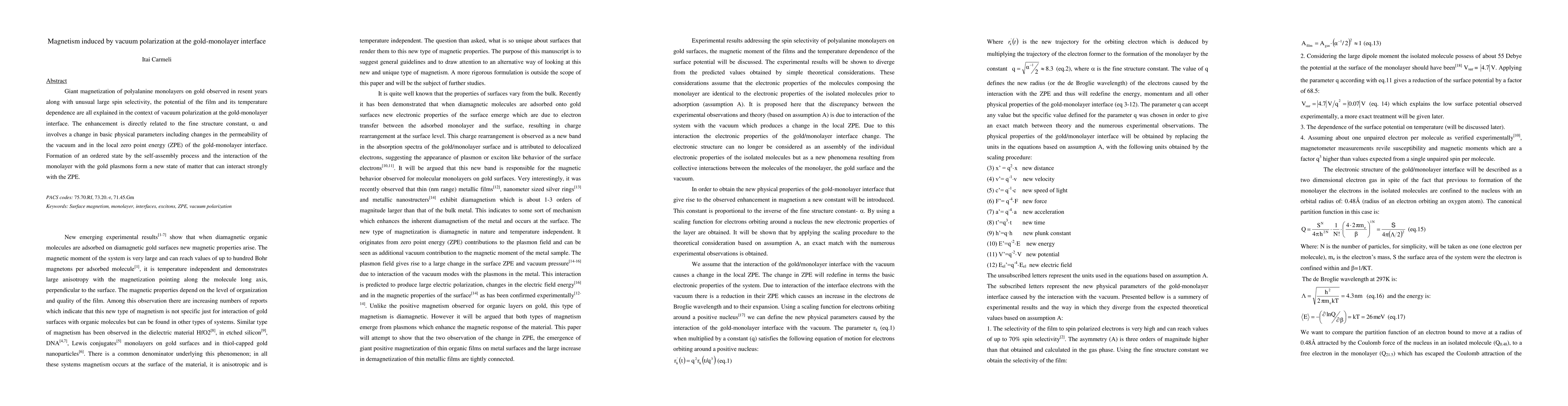 Giant magnetization of polyalanine monolayers on gold observed in resent years along with unusual large spin selectivity, the potential of the film and its temperature dependence are all explained in the context of vacuum polarization at the gold-monolayer interface. The enhancement is directly related to the fine structure constant, and involves a change in basic physical parameters including changes in the permeability of the vacuum and in the local zero point energy of the gold monolayer interface. Formation of an ordered state by the self-assembly process and the interaction of the monolayer with the gold plasmons form a new state of matter that can interact strongly with the zero point energy.
