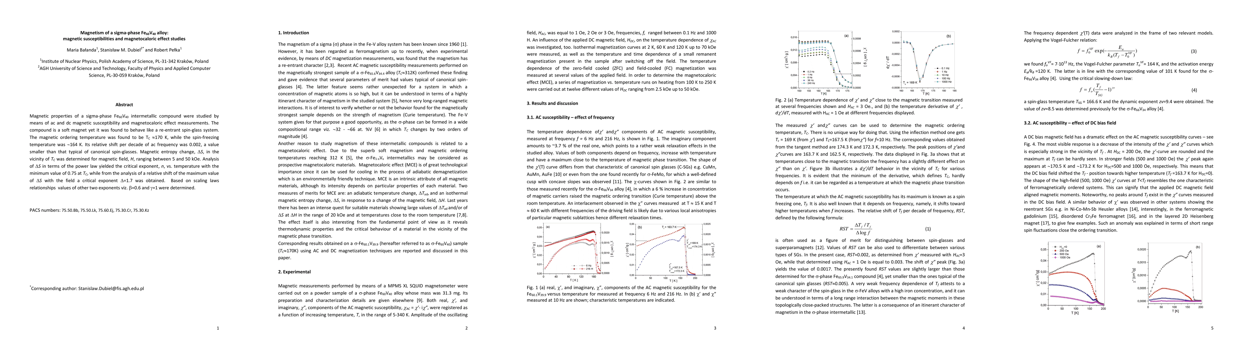 Magnetic properties of a sigma-phase Fe60V40 intermetallic compound were studied by means of ac and dc magnetic susceptibility and magnetocaloric effect measurements. The compound is a soft magnet yet it was found to behave like a re-entrant spin-glass system. The magnetic ordering temperature was found to be T_C ca.170 K, while the spin-freezing temperature was ca.164 K. Its relative shift per decade of ac frequency was 0.002, a value smaller than that typical of canonical spin-glasses. Magnetic entropy change, DeltaS, in the vicinity of T_C was determined for magnetic field, H, ranging between 5 and 50 kOe. Analysis of DeltaS in terms of the power law yielded the critical exponent, n, vs. temperature with the minimum value of 0.75 at T_C, while from the analysis of a relative shift of the maximum value of DeltaS with the field a critical exponent Delta=1.7 was obtained. Based on scaling laws relationships values of other two exponents viz. betha=0.6 and gamma=1 were determined.