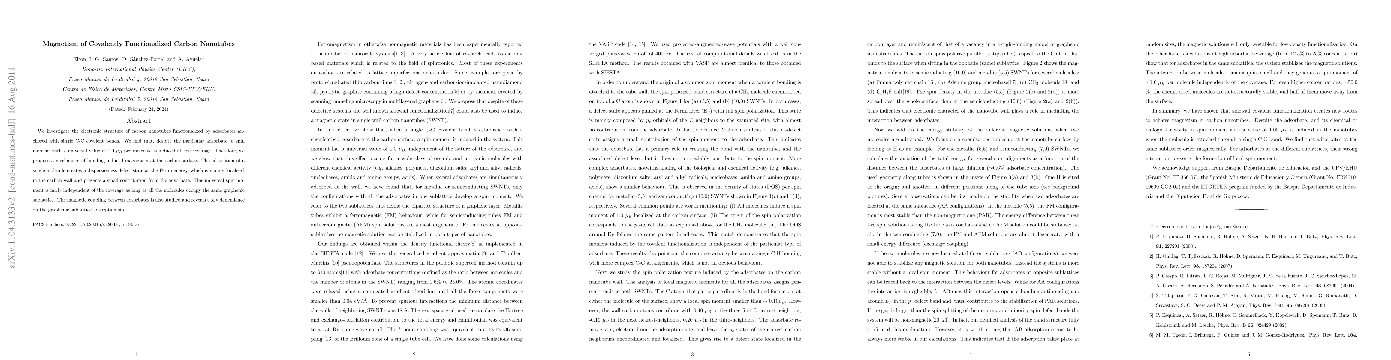 This work demonstrates that covalent functionalization of side walls can induce magnetism in carbon nanotubes, which is distinct from previous findings on topological doping or surface functionalization.