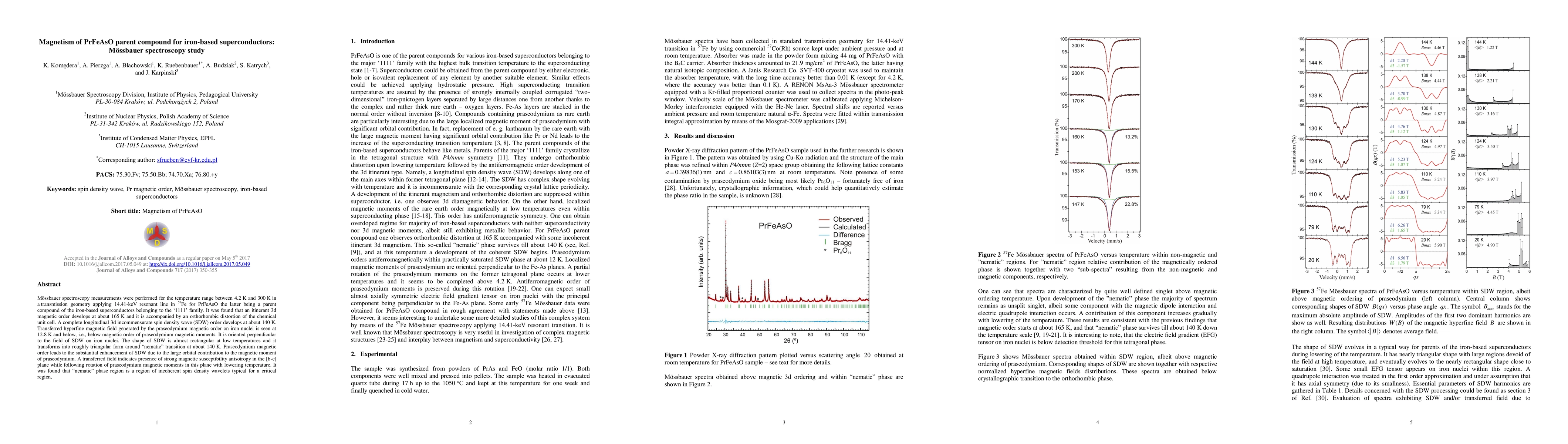 Moessbauer spectroscopy measurements were performed for the temperature range between 4.2 K and 300 K in a transmission geometry applying 14.41-keV resonant line in 57Fe for PrFeAsO the latter being a parent compound of the iron-based superconductors belonging to the '1111' family. It was found that an itinerant 3d magnetic order develops at about 165 K and it is accompanied by an orthorhombic distortion of the chemical unit cell. A complete longitudinal 3d incommensurate spin density wave (SDW) order develops at about 140 K. Transferred hyperfine magnetic field generated by the praseodymium magnetic order on iron nuclei is seen at 12.8 K and below, i.e., below magnetic order of praseodymium magnetic moments. It is oriented perpendicular to the field of SDW on iron nuclei. The shape of SDW is almost rectangular at low temperatures and it transforms into roughly triangular form around 'nematic' transition at about 140 K. Praseodymium magnetic order leads to the substantial enhancement of SDW due to the large orbital contribution to the magnetic moment of praseodymium. A transferred field indicates presence of strong magnetic susceptibility anisotropy in the [b-c] plane while following rotation of praseodymium magnetic moments in this plane with lowering temperature. It was found that 'nematic' phase region is a region of incoherent spin density wavelets typical for a critical region.