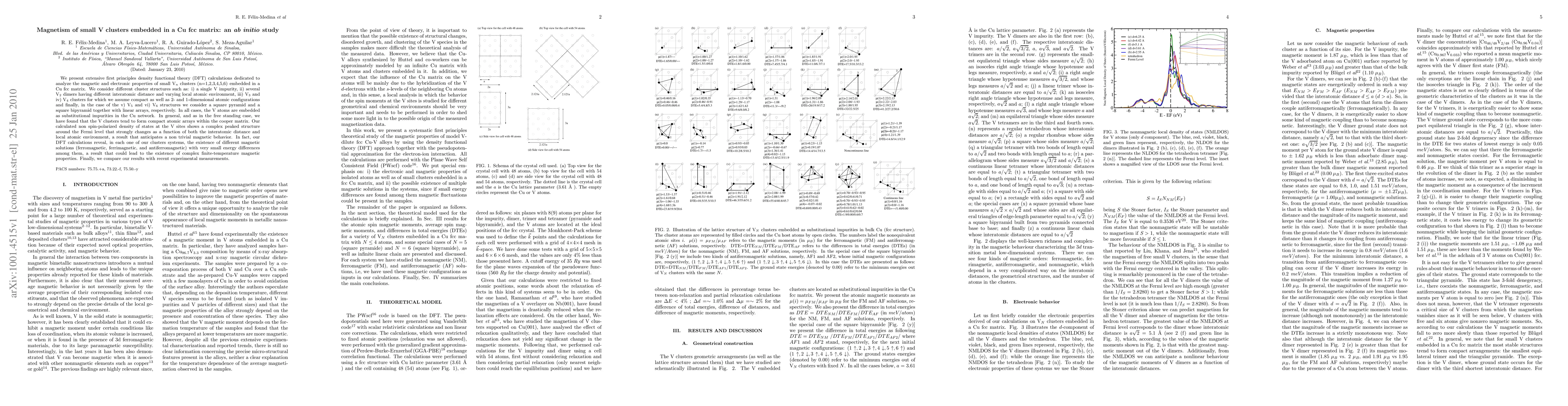 We present extensive first principles density functional theory (DFT) calculations dedicated to analyze the magnetic and electronic properties of small V$_{n}$ clusters (n=1,2,3,4,5,6) embedded in a Cu fcc matrix. We consider different cluster structures such as: i) a single V impurity, ii) several V$_{2}$ dimers having different interatomic distance and varying local atomic environment, iii) V$_{3}$ and iv) V$_{4}$ clusters for which we assume compact as well as 2- and 1-dimensional atomic configurations and finally, in the case of the v) V$_{5}$ and vi) V$_{6}$ structures we consider a square pyramid and a square bipyramid together with linear arrays, respectively. In all cases, the V atoms are embedded as substitutional impurities in the Cu network. In general, and as in the free standing case, we have found that the V clusters tend to form compact atomic arrays within the cooper matrix. Our calculated non spin-polarized density of states at the V sites shows a complex peaked structure around the Fermi level that strongly changes as a function of both the interatomic distance and local atomic environment, a result that anticipates a non trivial magnetic behavior. In fact, our DFT calculations reveal, in each one of our clusters systems, the existence of different magnetic solutions (ferromagnetic, ferrimagnetic, and antiferromagnetic) with very small energy differences among them, a result that could lead to the existence of complex finite-temperature magnetic properties. Finally, we compare our results with recent experimental measurements.