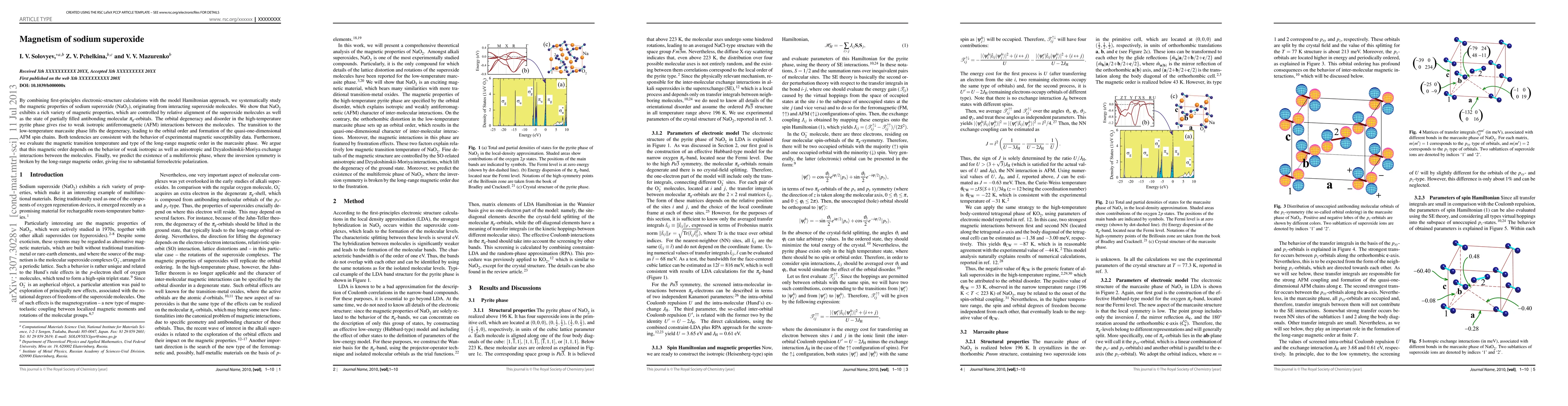 By combining first-principles electronic-structure calculations with the model Hamiltonian approach, we systematically study the magnetic properties of sodium superoxide (NaO2), originating from interacting superoxide molecules. We show that NaO2 exhibits a rich variety of magnetic properties, which are controlled by relative alignment of the superoxide molecules as well as the state of partially filled antibonding molecular \pi_g-orbitals. The orbital degeneracy and disorder in the high-temperature pyrite phase gives rise to weak isotropic antiferromagnetic (AFM) interactions between the molecules. The transition to the low-temperature marcasite phase lifts the degeneracy, leading to the orbital order and formation of the quasi-one-dimensional AFM spin chains. Both tendencies are consistent with the behavior of experimental magnetic susceptibility data. Furthermore, we evaluate the magnetic transition temperature and type of the long-range magnetic order in the marcasite phase. We argue that this magnetic order depends on the behavior of weak isotropic as well as anisotropic and Dzyaloshinskii-Moriya exchange interactions between the molecules. Finally, we predict the existence of a multiferroic phase, where the inversion symmetry is broken by the long-range magnetic order, giving rise to substantial ferroelectric polarization.