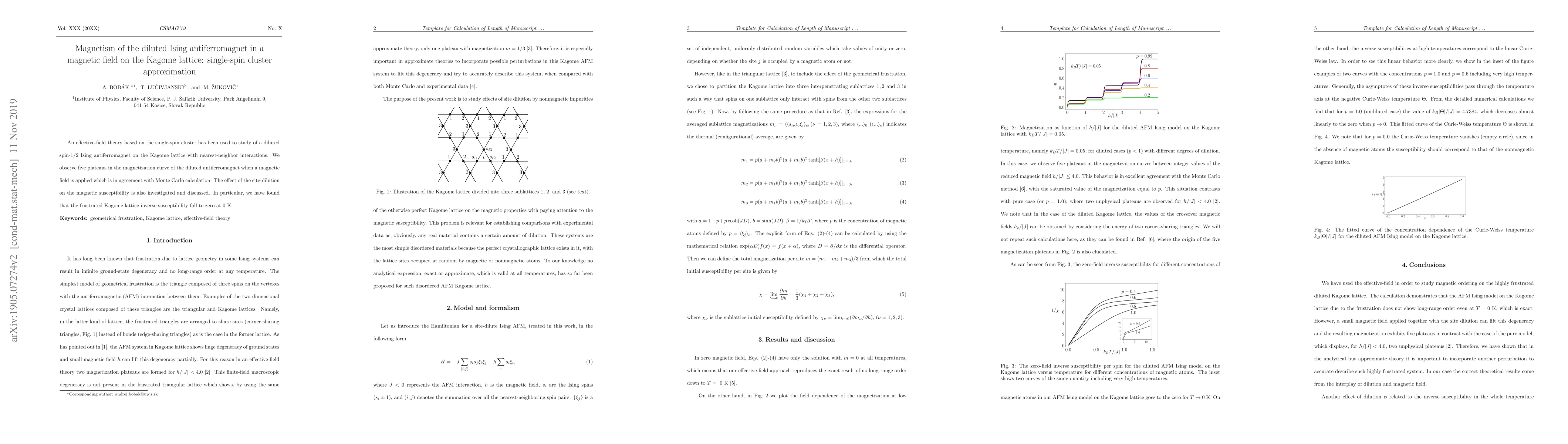 This study employs an effective-field theory on a single-spin cluster to investigate the magnetism of a diluted spin-$1/2$ Ising antiferromagnet on the Kagome lattice. The research reveals five plateaus in the magnetization curve under a magnetic field, aligning with Monte Carlo simulations, and discusses the impact of site-dilution on magnetic susceptibility, noting that the inverse susceptibility vanishes at $0$K.