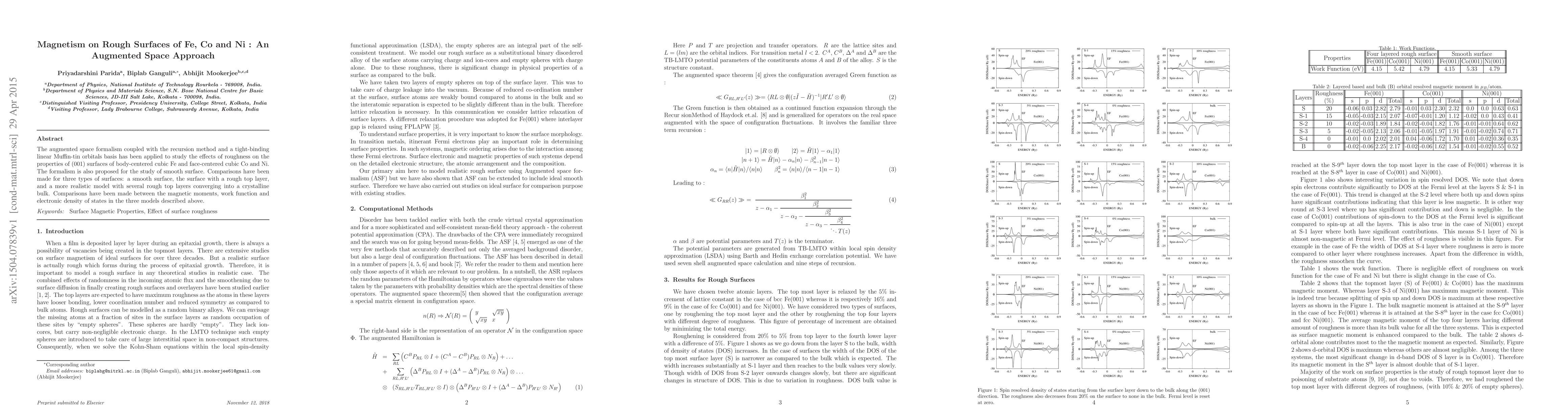 The augmented space formalism coupled with the recursion method and a tight-binding linear Muffin-tin orbitals basis has been applied to study the effects of roughness on the properties of (001) surfaces of body-centered cubic Fe and face-centered cubic Co and Ni. The formalism is also proposed for the study of smooth surface. Comparisons have been made for three types of surfaces: a smooth surface, the surface with a rough top layer, and a more realistic model with several rough top layers converging into a crystalline bulk. Comparisons have been made between the magnetic moments, work function and electronic density of states in the three models described above.