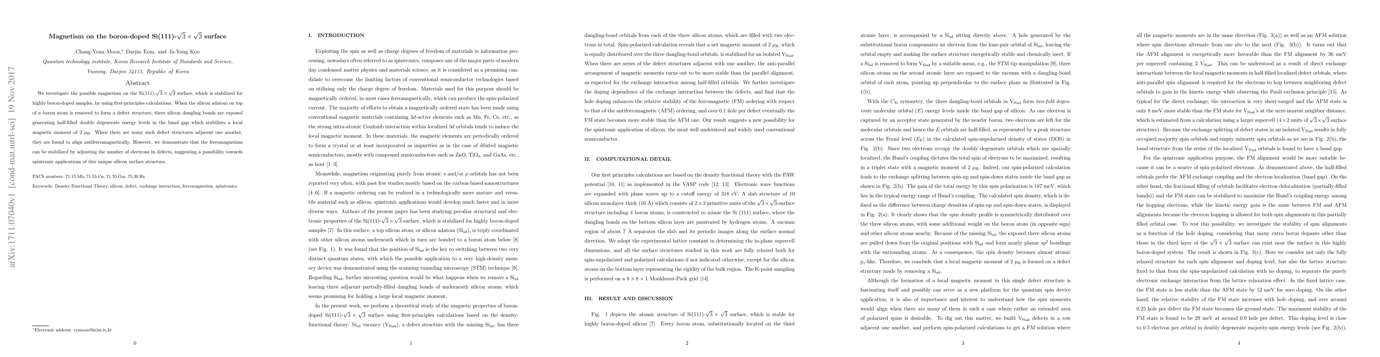 This research explores magnetism on boron-doped Si(111)-$\sqrt 3 \times \sqrt 3$ surfaces using first-principles calculations, revealing that defect structures can stabilize local magnetic moments and that ferromagnetism can be achieved by adjusting electron numbers, indicating potential for spintronic applications.