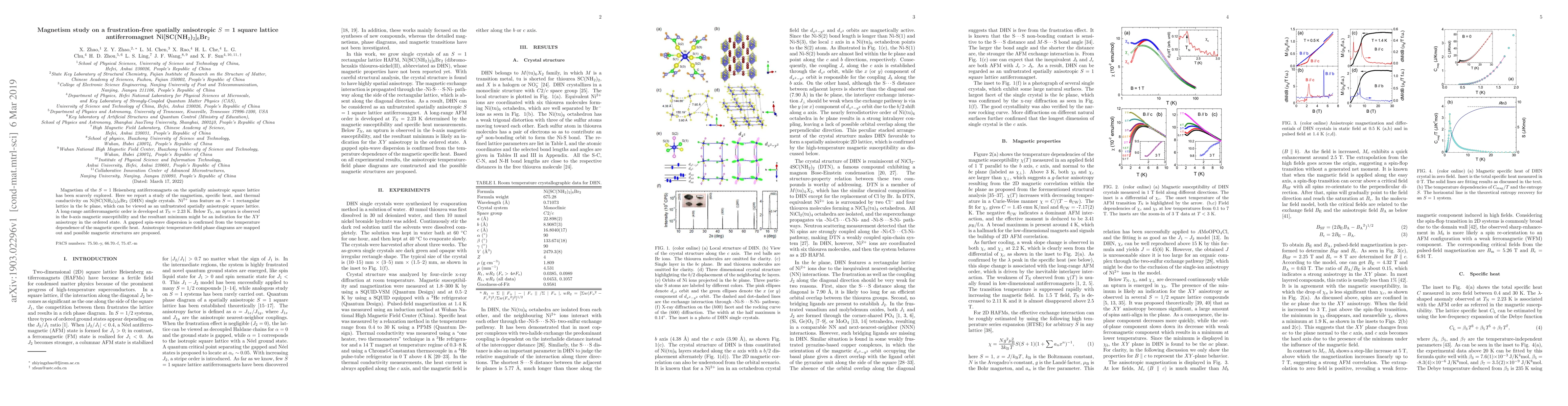 The research investigates the magnetism of a unique $S$ = 1 Heisenberg antiferromagnet on a spatially anisotropic square lattice using Ni[SC(NH$_2$)$_2$]$_6$Br$_2$ (DHN) single crystals. Key findings include the identification of long-range antiferromagnetic order at 2.23 K, evidence of $XY$ anisotropy, gapped spin-wave dispersion, and anisotropic temperature-field phase diagrams.