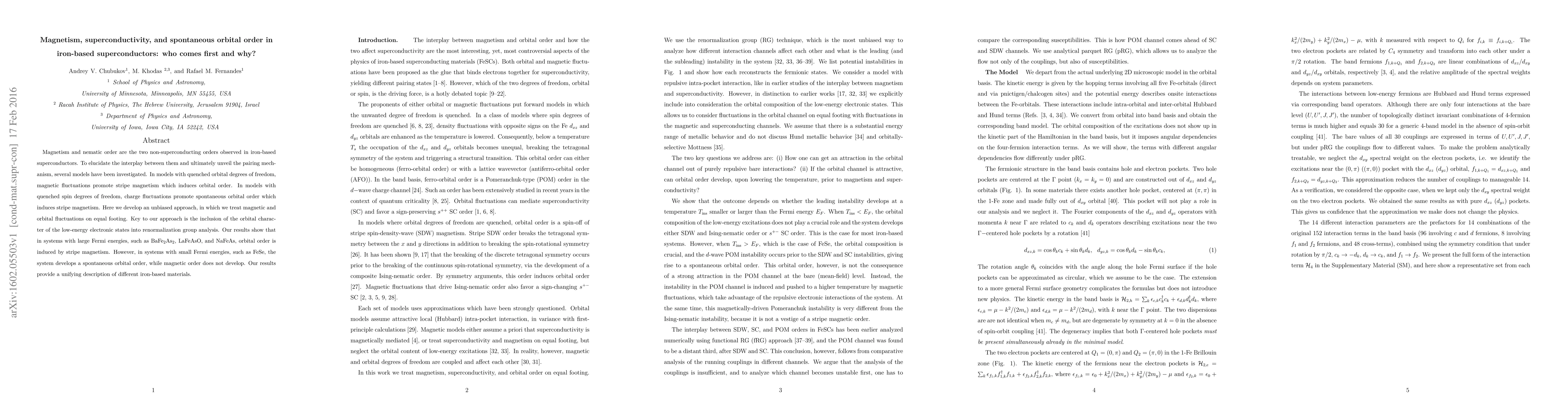 Magnetism and nematic order are the two non-superconducting orders observed in iron-based superconductors. To elucidate the interplay between them and ultimately unveil the pairing mechanism, several models have been investigated. In models with quenched orbital degrees of freedom, magnetic fluctuations promote stripe magnetism which induces orbital order. In models with quenched spin degrees of freedom, charge fluctuations promote spontaneous orbital order which induces stripe magnetism. Here we develop an unbiased approach, in which we treat magnetic and orbital fluctuations on equal footing. Key to our approach is the inclusion of the orbital character of the low-energy electronic states into renormalization group analysis. Our results show that in systems with large Fermi energies, such as BaFe2As2, LaFeAsO, and NaFeAs, orbital order is induced by stripe magnetism. However, in systems with small Fermi energies, such as FeSe, the system develops a spontaneous orbital order, while magnetic order does not develop. Our results provide a unifying description of different iron-based materials.