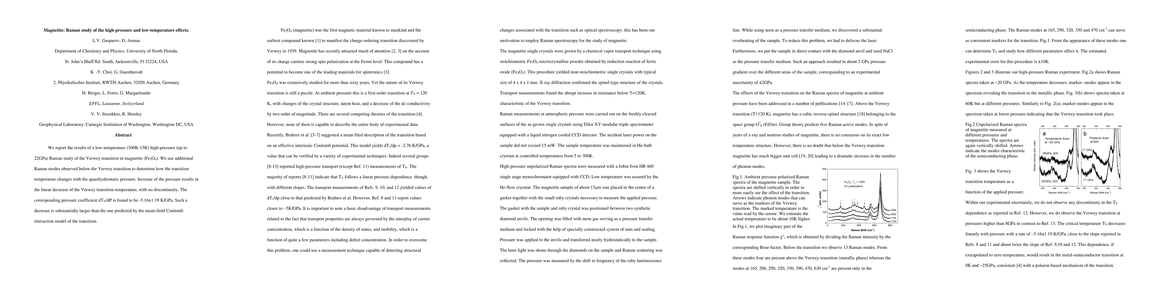 This study investigates the Verwey transition in magnetite under low temperatures and high pressures using Raman spectroscopy. The results show a linear decrease in the transition temperature with increasing pressure, with a pressure coefficient of approximately -5.2 K/GPa, which is significantly larger than predictions from the mean-field Coulomb interaction model.
