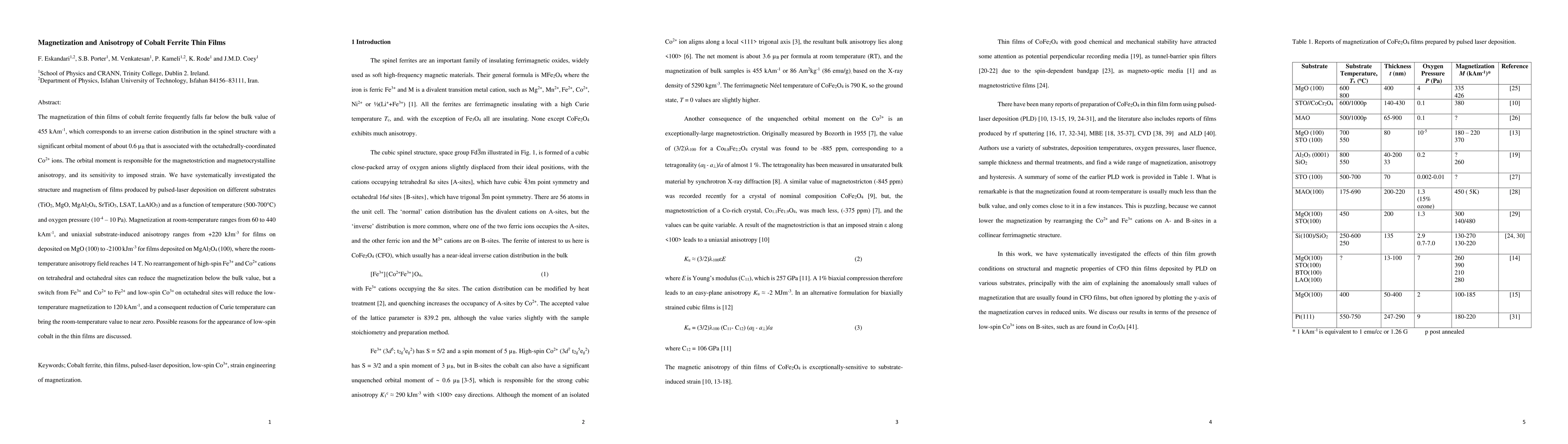 This study investigates the magnetization and anisotropy of cobalt ferrite thin films deposited via pulsed-laser deposition on various substrates, revealing significant variations in magnetization and anisotropy due to substrate-induced effects and oxygen pressure. The films show reduced magnetization and altered anisotropy, potentially due to the presence of low-spin Co3+ ions, which can drastically lower the Curie temperature.