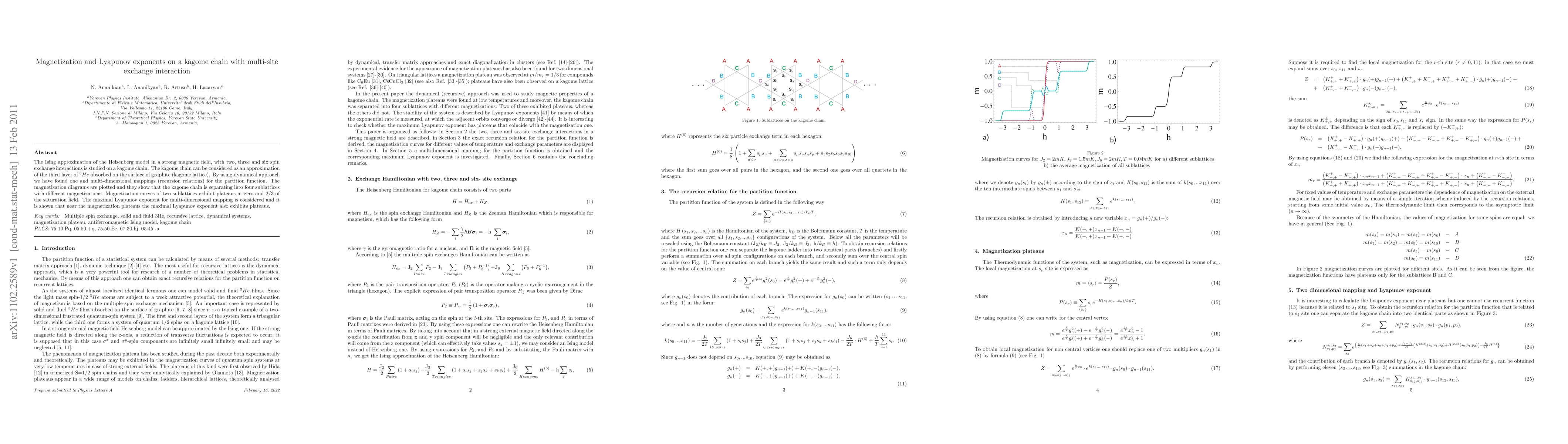 The Ising approximation of the Heisenberg model in a strong magnetic field, with two, three and six spin exchange interactions is studied on a kagome chain. The kagome chain can be considered as an approximation of the third layer of 3He absorbed on the surface of graphite (kagome lattice). By using dynamical approach we have found one and multi-dimensional mappings (recursion relations) for the partition function. The magnetization diagrams are plotted and they show that the kagome chain is separating into four sublattices with different magnetizations. Magnetization curves of two sublattices exhibit plateaus at zero and 2/3 of the saturation field. The maximal Lyapunov exponent for multi-dimensional mapping is considered and it is shown that near the magnetization plateaus the maximal Lyapunov exponent also exhibits plateaus.