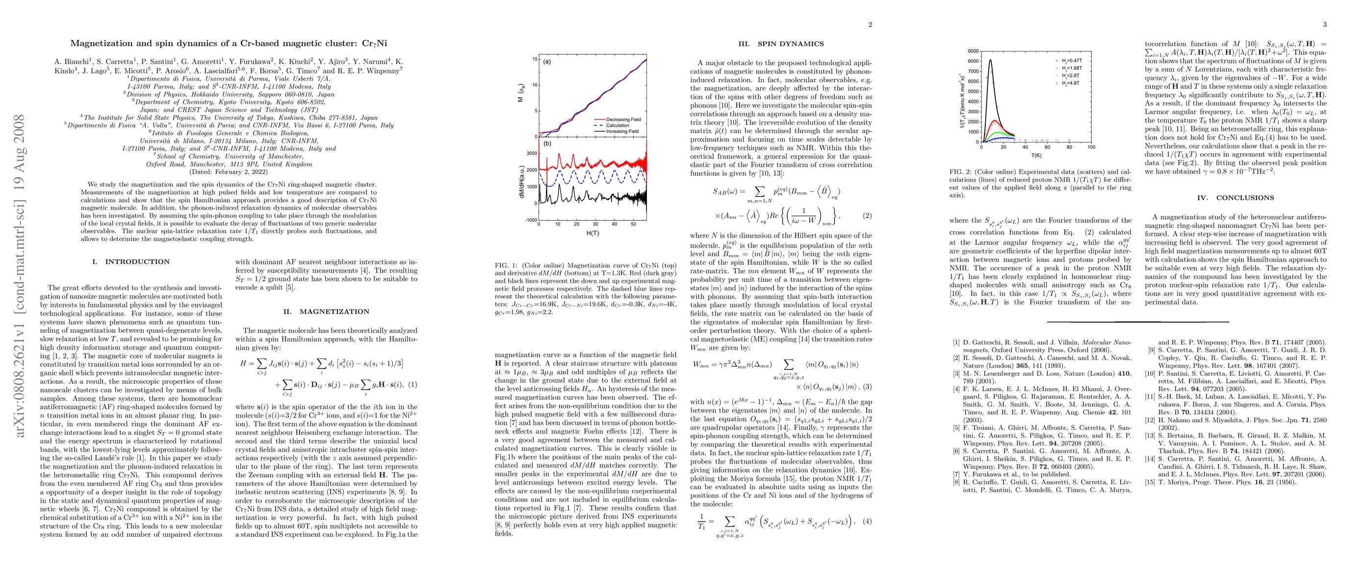 We study the magnetization and the spin dynamics of the Cr$_7$Ni ring-shaped magnetic cluster. Measurements of the magnetization at high pulsed fields and low temperature are compared to calculations and show that the spin Hamiltonian approach provides a good description of Cr$_7$Ni magnetic molecule. In addition, the phonon-induced relaxation dynamics of molecular observables has been investigated. By assuming the spin-phonon coupling to take place through the modulation of the local crystal fields, it is possible to evaluate the decay of fluctuations of two generic molecular observables. The nuclear spin-lattice relaxation rate $1/T_1$ directly probes such fluctuations, and allows to determine the magnetoelastic coupling strength.
