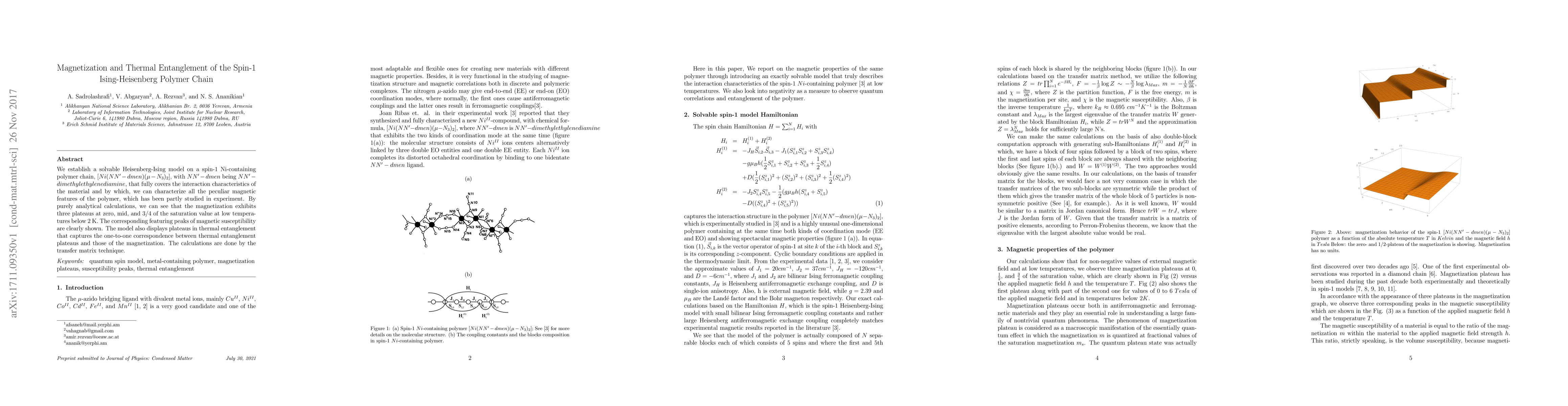 We establish a solvable Heisenberg-Ising model on a spin-1 Ni-containing polymer chain, $[Ni (NN'-dmen) (\mu-N_3)_2]$, with $NN'-dmen$ being $NN'-dimethylethylenediamine$, that fully covers the interaction characteristics of the material and by which, we can characterize all the peculiar magnetic features of the polymer, which has been partly studied in experiment. By purely analytical calculations, we can see that the magnetization exhibits three plateaus at zero, mid, and 3/4 of the saturation value at low temperatures below 2 K. The corresponding featuring peaks of magnetic susceptibility are clearly shown. The model also displays plateaus in thermal entanglement that captures the one-to-one correspondence between thermal entanglement plateaus and those of the magnetization. The calculations are done by the transfer matrix technique.