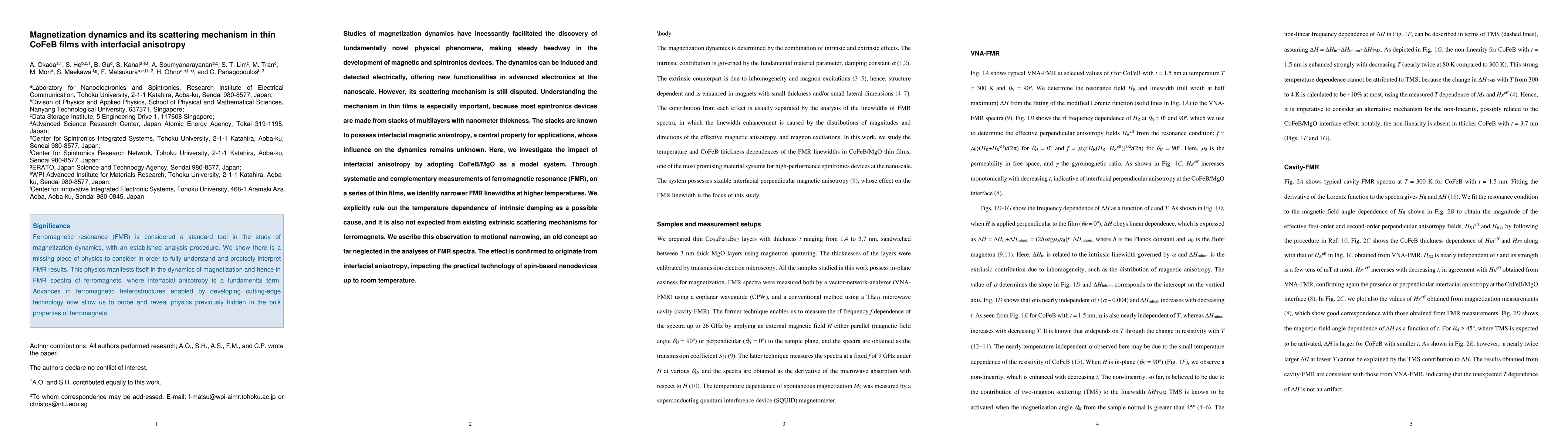 This paper investigates magnetization dynamics in thin CoFeB films with interfacial anisotropy, finding that interfacial anisotropy influences the dynamics through motional narrowing, which narrows ferromagnetic resonance linewidths at higher temperatures, thus impacting the performance of spin-based nanodevices.