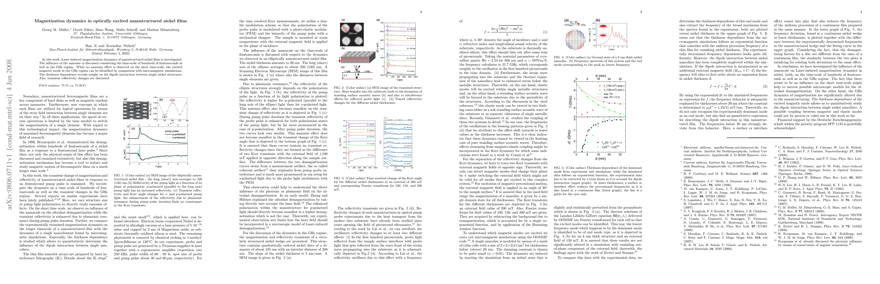 This study investigates the magnetization dynamics in nanostructured nickel films excited by laser, finding no nanosize effect on femtosecond timescales but identifying a GHz regime magnetic mode through micromagnetic simulations. Thickness dependence provides insights into dipole interactions among nickel structures.