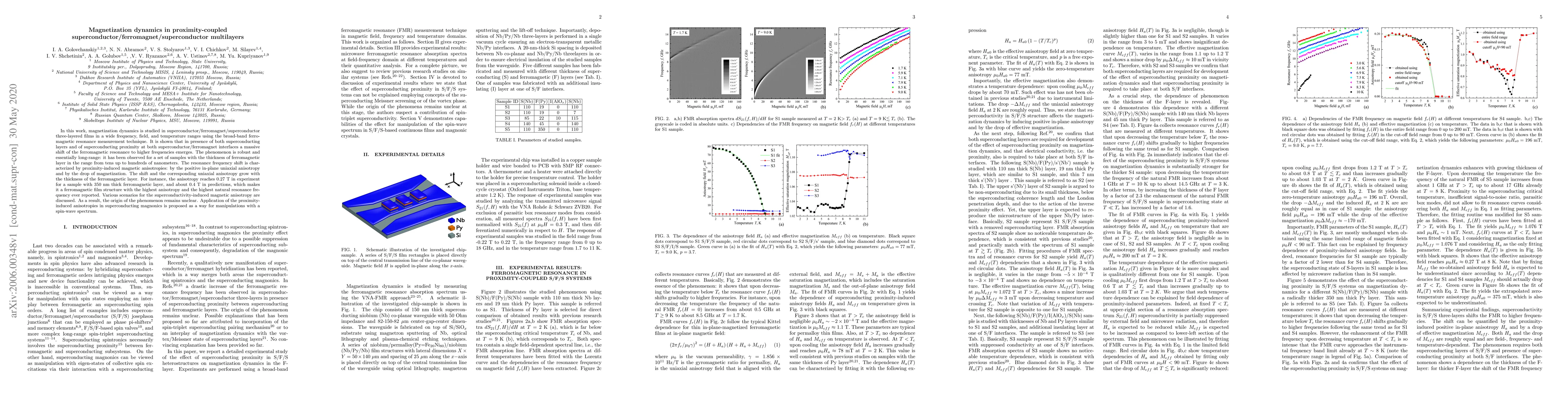 This paper investigates magnetization dynamics in superconductor/ferromagnet/superconductor multilayers, revealing a significant frequency shift in ferromagnetic resonance due to superconducting proximity effects. The shift, characterized by induced magnetic anisotropies, increases with the ferromagnetic layer thickness, potentially enabling novel applications in superconducting magnonics.