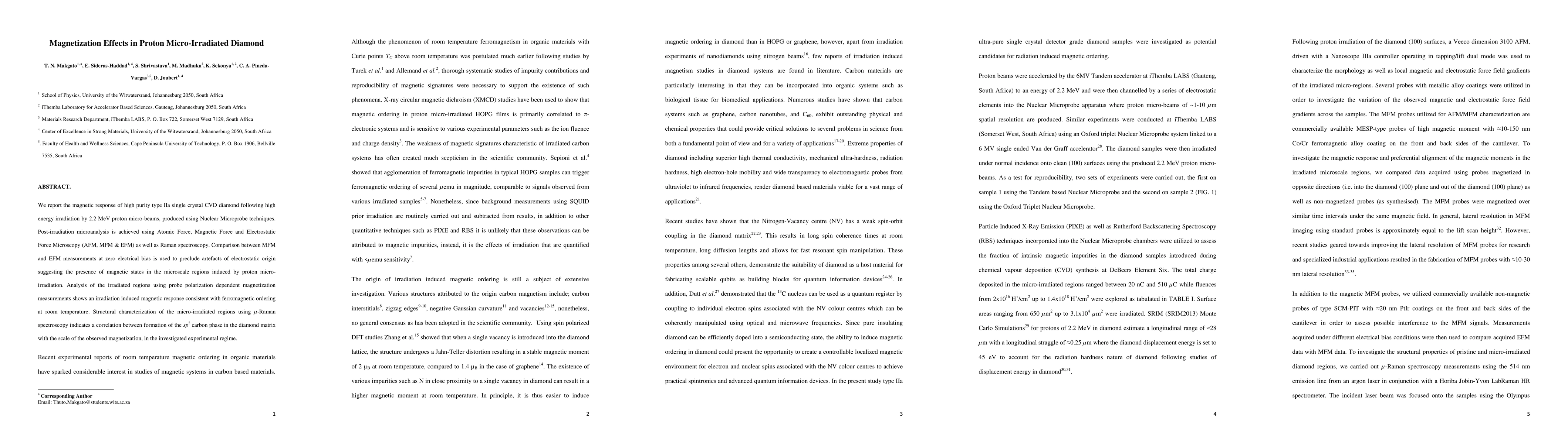 This study investigates the magnetic response of proton-irradiated type IIa CVD diamond using Nuclear Microprobe techniques, revealing ferromagnetic ordering at room temperature. Micro-Raman spectroscopy links the observed magnetization to the formation of sp2 carbon phases in the irradiated regions.