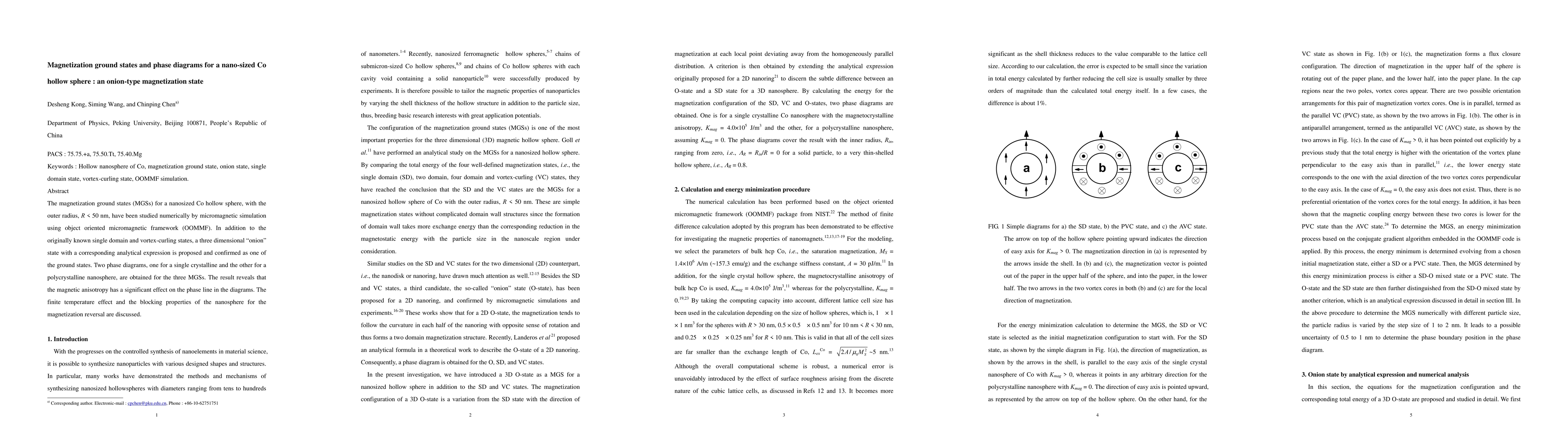 The magnetization ground states (MGSs) for a nanosized Co hollow sphere, with the outer radius, R < 50 nm, have been studied numerically by micromagnetic simulation using object oriented micromagnetic framework (OOMMF). In addition to the originally known single domain and vortex-curling states, a three dimensional "onion" state with a corresponding analytical expression is proposed and confirmed as one of the ground states. Two phase diagrams, one for a single crystalline and the other for a polycrystalline nanosphere, are obtained for the three MGSs. The result reveals that the magnetic anisotropy has a significant effect on the phase line in the diagrams. The finite temperature effect and the blocking properties of the nanosphere for the magnetization reversal are discussed.