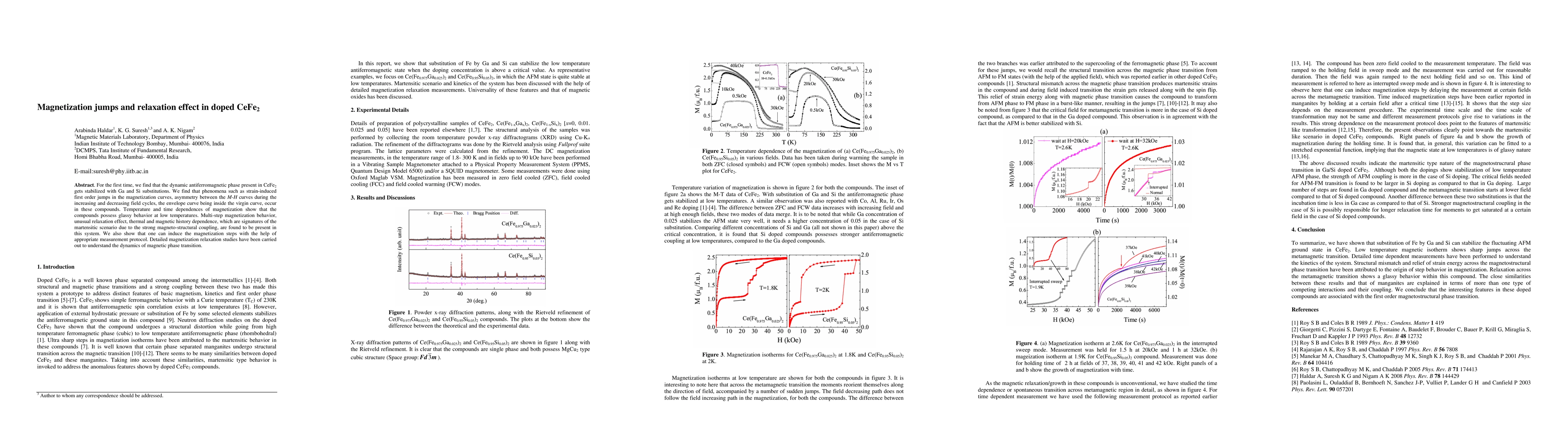 For the first time, we find that the dynamic antiferromagnetic phase present in CeFe2 gets stabilized with Ga and Si substitutions. We find that phenomena such as strain-induced first order jumps in the magnetization curves, asymmetry between the M-H curves during the increasing and decreasing field cycles, the envelope curve being inside the virgin curve, occur in these compounds. Temperature and time dependences of magnetization show that the compounds possess glassy behavior at low temperatures. Multi-step magnetization behavior, unusual relaxation effect, thermal and magnetic history dependence, which are signatures of the martensitic scenario due to the strong magneto-structural coupling, are found to be present in this system. We also show that one can induce the magnetization steps with the help of appropriate measurement protocol. Detailed magnetization relaxation studies have been carried out to understand the dynamics of magnetic phase transition.
