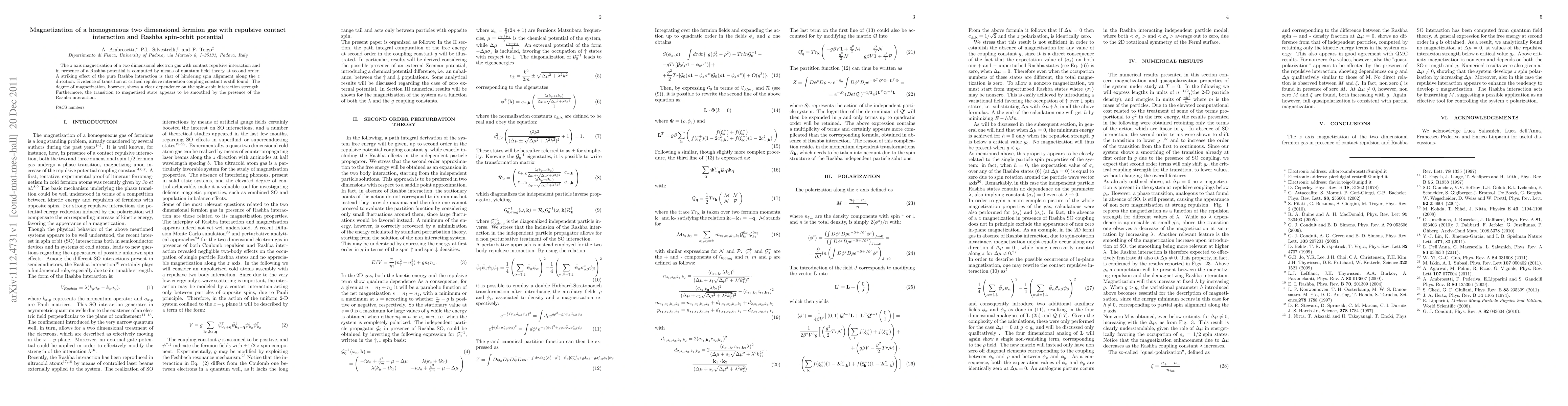 The z axis magnetization of a two dimensional electron gas with contact repulsive interaction and in presence of a Rashba potential is computed by means of quantum field theory at second order. A striking effect of the pure Rashba interaction is that of hindering spin alignment along the z direction. Evidence of transition at critical repulsive interaction coupling constant is still found. The degree of magnetization, however, shows a clear dependence on the spin-orbit interaction strength. Furthermore, the transition to magnetized state appears to be smoothed by the presence of the Rashba interaction.