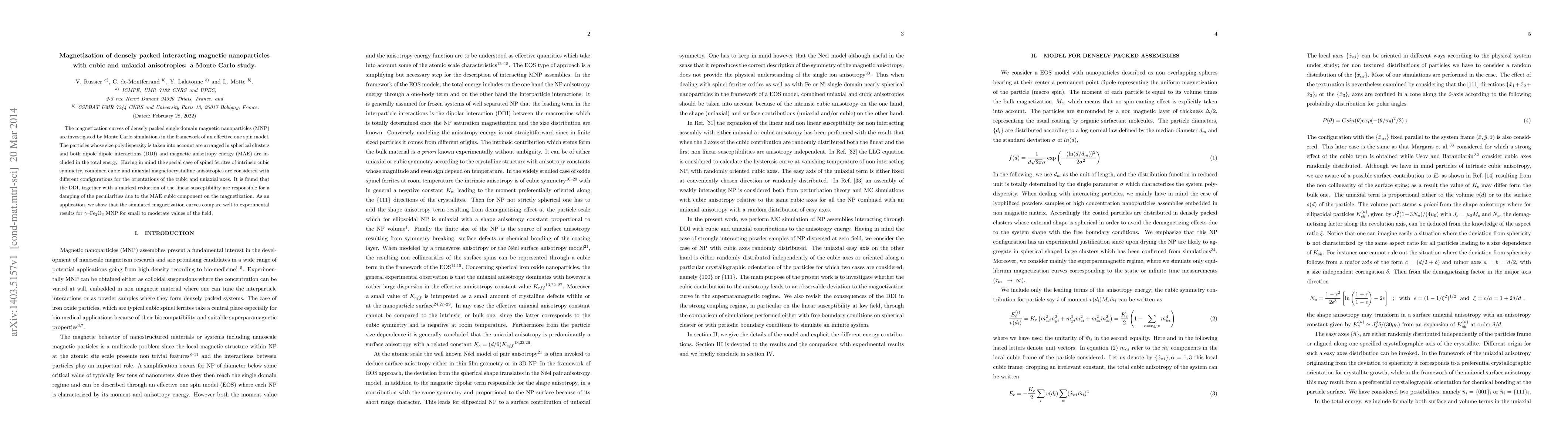 This study uses Monte Carlo simulations to investigate the magnetization of densely packed magnetic nanoparticles with cubic and uniaxial anisotropies, considering size polydispersity, dipole-dipole interactions, and magnetic anisotropy. The results show that dipole-dipole interactions significantly dampen the effects of cubic anisotropy on magnetization, and the simulated curves align well with experimental data for $\gamma$-Fe$_2$O$_3$ nanoparticles.