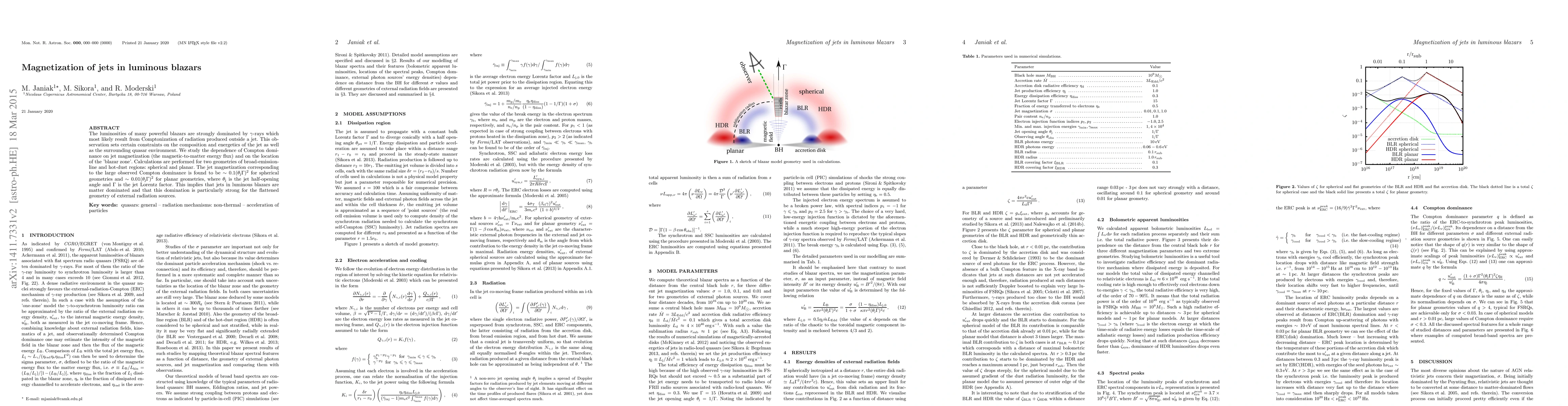Luminosities of many powerful blazars are strongly dominated by $\gamma$-rays which most likely result from Comptonization of radiation produced outside a jet. This observation sets certain constraints on composition and energetics of the jet as well as the surrounding quasar environment. We study the dependence of a Compton dominance on a jet magnetization (the magnetic-to-matter energy flux) and on the location of the 'blazar zone'. Calculations are performed for two geometries of broad-emission-line and hot-dust regions: spherical and planar. The jet magnetization corresponding to the large observed Compton dominance is found to be $\sim 0.1 (\theta_{\rm j} \Gamma)^2$ for spherical geometries and $\sim 0.01 (\theta_{\rm j} \Gamma)^2$ for planar geometries, where $\theta_{\rm j}$ is the jet half-opening angle and $\Gamma$ is the jet Lorentz factor. This implies that jets in luminous blazars are matter dominated and that this domination is particularly strong for the flattened geometry of external radiation sources.