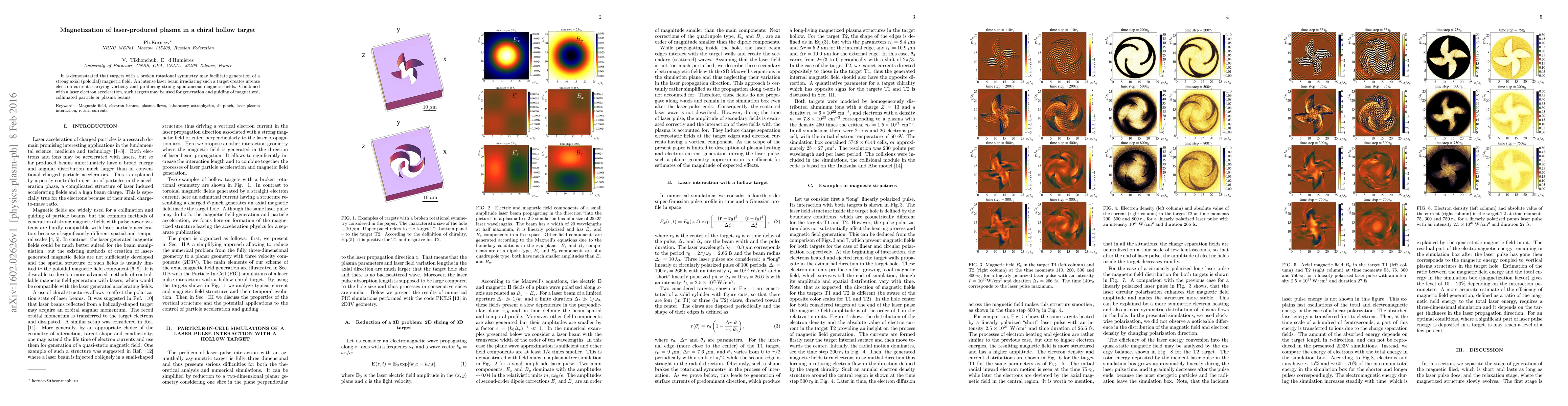 It is demonstrated that targets with a broken rotational symmetry may facilitate generation of a strong axial (poloidal) magnetic field. An intense laser beam irradiating such a target creates intense electron currents carrying vorticity and producing strong spontaneous magnetic fields. Combined with a laser electron acceleration, such targets may be used for generation and guiding of magnetized, collimated particle or plasma beams.