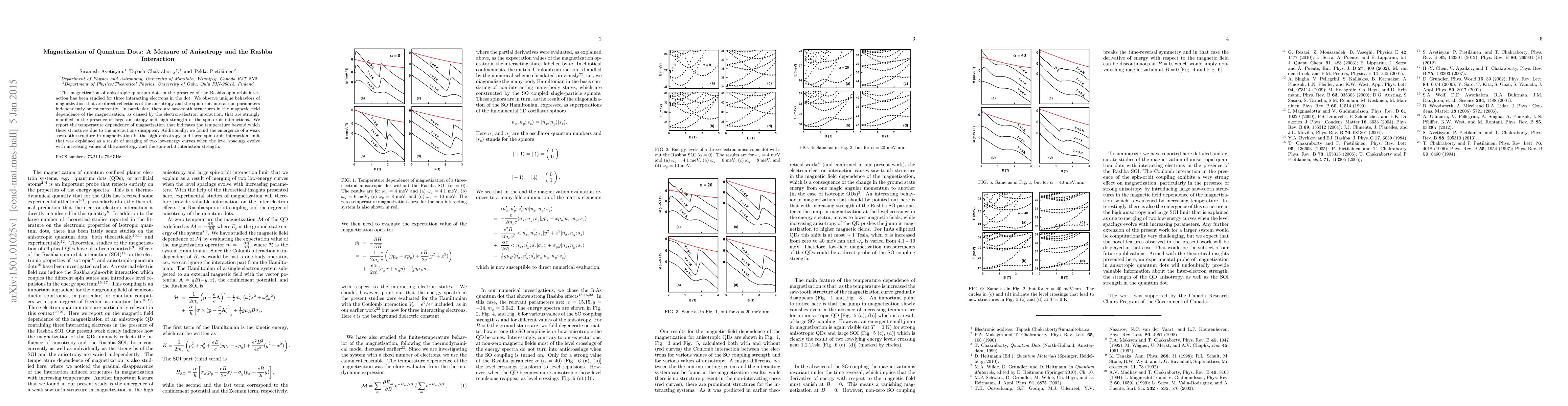 The magnetization of anisotropic quantum dots in the presence of the Rashba spin-orbit interaction has been studied for three interacting electrons in the dot. We observe unique behaviors of magnetization that are direct reflections of the anisotropy and the spin-orbit interaction parameters independently or concurrently. In particular, there are saw-tooth structures in the magnetic field dependence of the magnetization, as caused by the electron-electron interaction, that are strongly modified in the presence of large anisotropy and high strength of the spin-orbit interactions. We report the temperature dependence of magnetization that indicates the temperature beyond which these structures due to the interactions disappear. Additionally, we found the emergence of a weak saw-tooth structure in magnetization in the high anisotropy and large spin-orbit interaction limit that was explained as a result of merging of two low-energy curves when the level spacings evolve with increasing values of the anisotropy and the spin-orbit interaction strength.