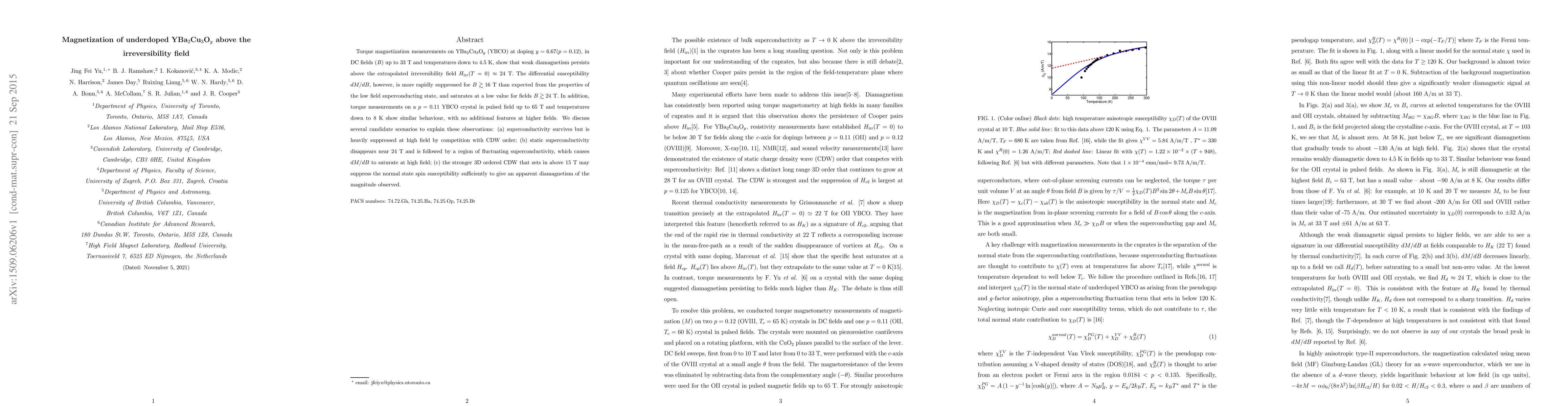 Torque magnetization measurements on YBa$_2$Cu$_3$O$_{y}$ (YBCO) at doping $y=6.67$($p=0.12$), in DC fields ($B$) up to 33 T and temperatures down to 4.5 K, show that weak diamagnetism persists above the extrapolated irreversibility field $H_{\rm irr} (T=0) \approx 24$ T. The differential susceptibility $dM/dB$, however, is more rapidly suppressed for $B\gtrsim 16$ T than expected from the properties of the low field superconducting state, and saturates at a low value for fields $B \gtrsim 24$ T. In addition, torque measurements on a $p=0.11$ YBCO crystal in pulsed field up to 65 T and temperatures down to 8 K show similar behaviour, with no additional features at higher fields. We discuss several candidate scenarios to explain these observations: (a) superconductivity survives but is heavily suppressed at high field by competition with CDW order; (b) static superconductivity disappears near 24 T and is followed by a region of fluctuating superconductivity, which causes $dM/dB$ to saturate at high field; (c) the stronger 3D ordered CDW that sets in above 15 T may suppress the normal state spin susceptibility sufficiently to give an apparent diamagnetism of the magnitude observed.
