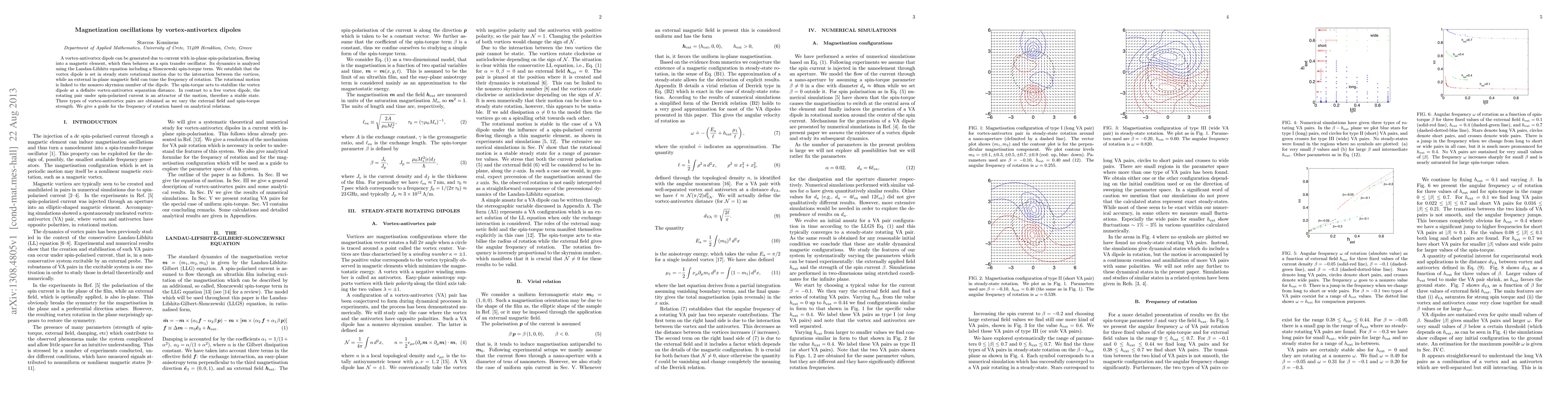 This paper investigates the dynamics of vortex-antivortex dipoles in magnetic elements under spin-polarized current, revealing their rotational motion and stabilization. The study uses the Landau-Lifshitz equation with Slonczewski spin-torque term, showing that the dipoles rotate at frequencies tunable by external magnetic fields, linked to their skyrmion number.