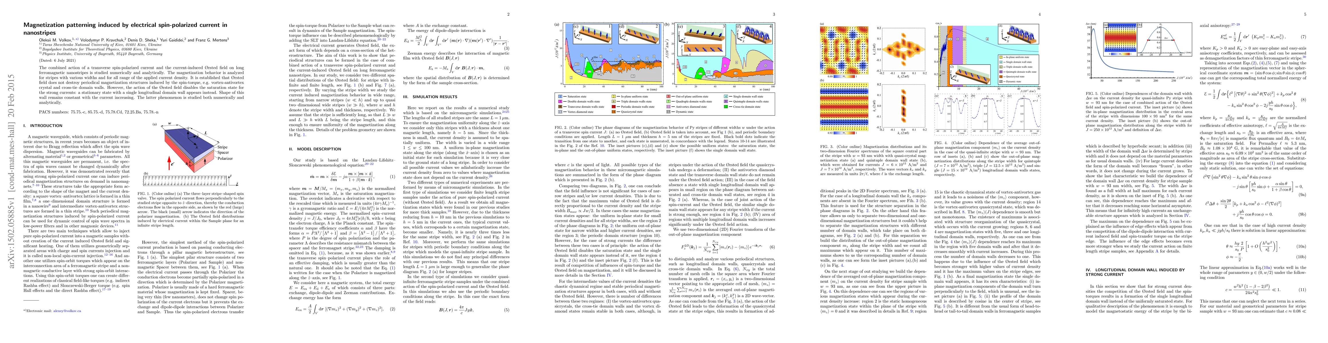 This paper investigates the magnetization patterning in ferromagnetic nanostripes under the influence of a transverse spin-polarized current and the associated {\O}rsted field. It finds that while the {\O}rsted field maintains periodic magnetization structures, it prevents saturation at high currents, leading to a stationary longitudinal domain wall instead.
