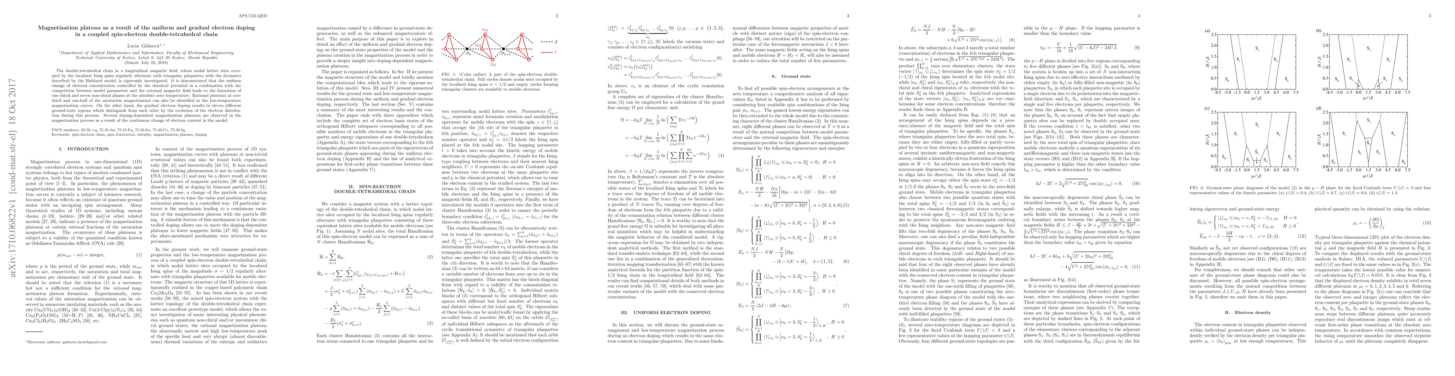 The double-tetrahedral chain in a longitudinal magnetic field, whose nodal lattice sites occupied by the localized Ising spins regularly alternate with triangular plaquettes with the dynamics described by the Hubbard model, is rigorously investigated. It is demonstrated that the uniform change of electron concentration controlled by the chemical potential in a combination with the competition between model parameters and the external magnetic field leads to the formation of one chiral and seven non-chiral phases at the absolute zero temperature. Rational plateaux at one-third and one-half of the saturation magnetization can also be identified in the low-temperature magnetization curves. On the other hand, the gradual electron doping results in eleven different ground-state regions which distinguish from each other by the evolution of the electron distribution during this process. Several doping-dependent magnetization plateaux are observed in the magnetization process as a result of the continuous change of electron content in the model.