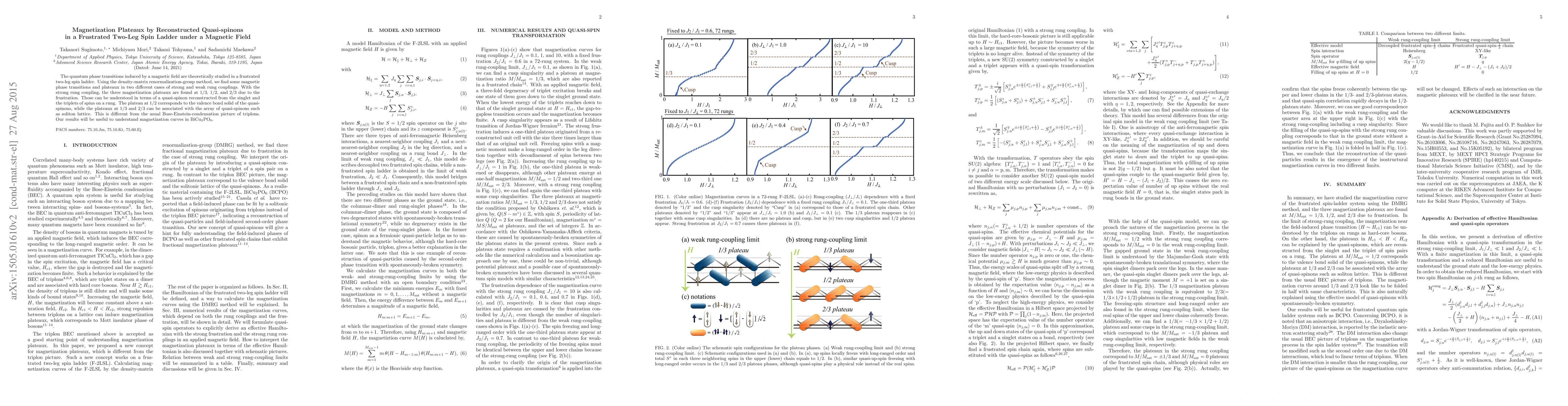 This study investigates quantum phase transitions in a frustrated two-leg spin ladder under a magnetic field, revealing magnetization plateaux at 1/3, 1/2, and 2/3 due to quasi-spinon reconstruction. The plateau at 1/2 corresponds to a valence bond solid, while 1/3 and 2/3 are linked to soliton lattices, differing from the typical triplon condensation model.