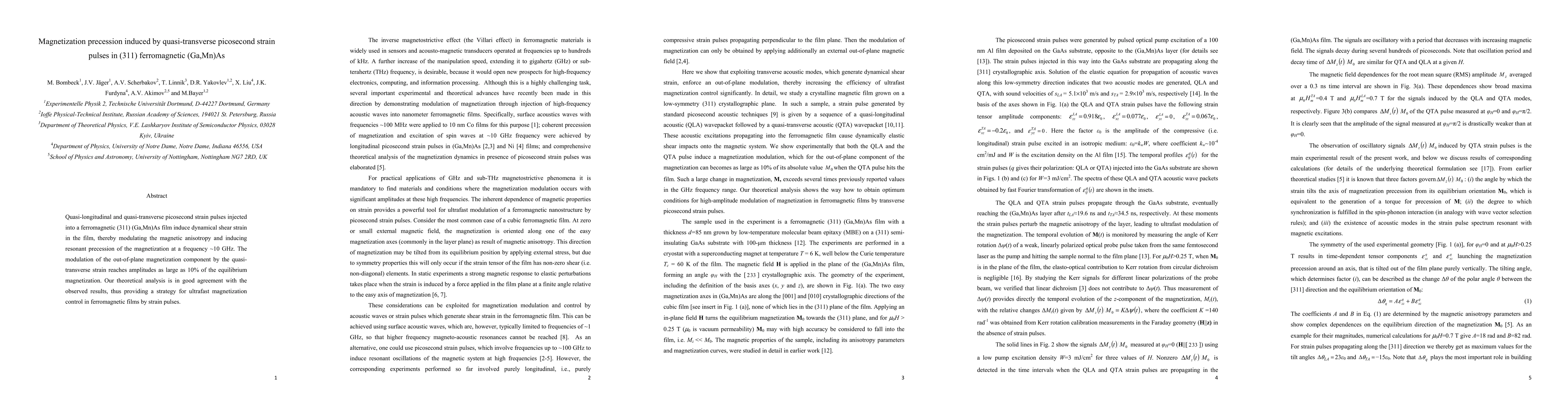 This paper investigates the magnetization precession in (311) ferromagnetic (Ga,Mn)As films induced by picosecond strain pulses, showing that quasi-transverse pulses can modulate the magnetic anisotropy and drive magnetization precession at ~10 GHz, with modulation amplitudes up to 10% of the equilibrium magnetization. Theoretical analysis aligns well with experimental observations, suggesting a method for ultrafast magnetization control via strain.