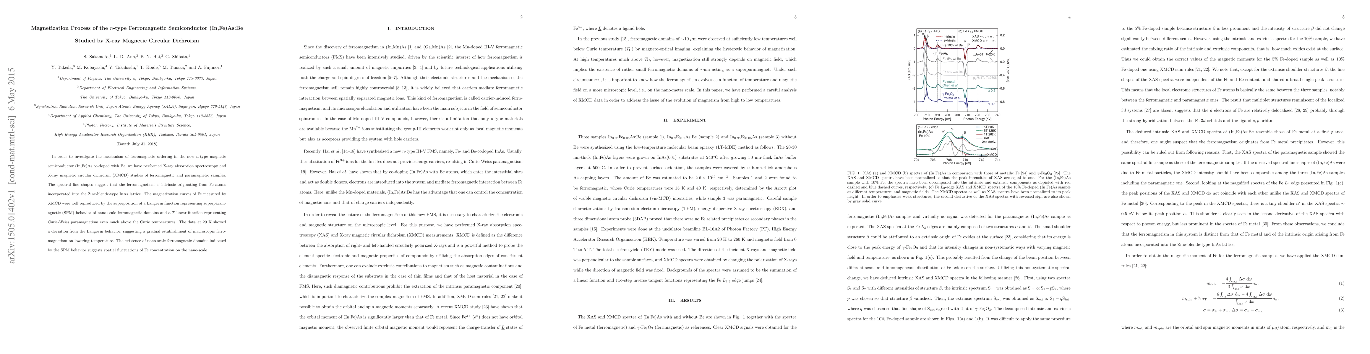This study investigates the magnetization process in the n-type ferromagnetic semiconductor (In,Fe)As:Be using X-ray magnetic circular dichroism. The results indicate that ferromagnetism originates from Fe atoms in the lattice, with nano-scale ferromagnetic domains exhibiting superparamagnetic behavior.
