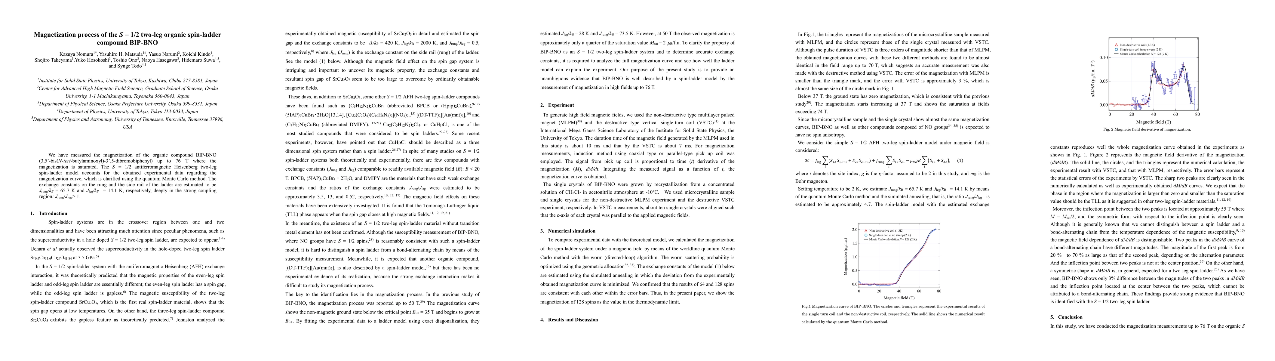 This study investigates the magnetization process of the organic spin-ladder compound BIP-BNO, revealing saturation at 76 T. The S = 1/2 antiferromagnetic Heisenberg model fits the experimental data, with estimated exchange constants J(rung)/kB = 65.7 K and J(leg)/kB = 14.1 K, indicating strong coupling.